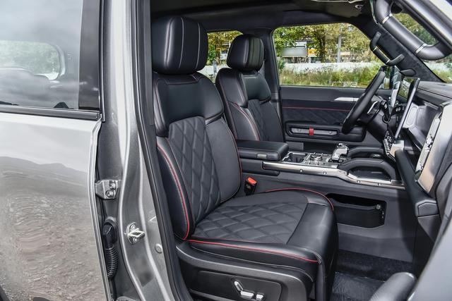 硬派外观之下,内饰的舒适与智能同样贴合多元出行需求。车内配备64英寸全景天窗,大幅提升视野开阔度;多功能方向盘采用未来感造型,操作便捷。座椅采用菱形格双排缝线工艺,实体按键采用钻石纹理设计,便于盲操作;车内设置9处软包覆拉手,在颠簸路段可提供额外支撑。内饰加入G318路线饰板氛围灯,搭配麂皮材质内饰,进一步提升触感体验。