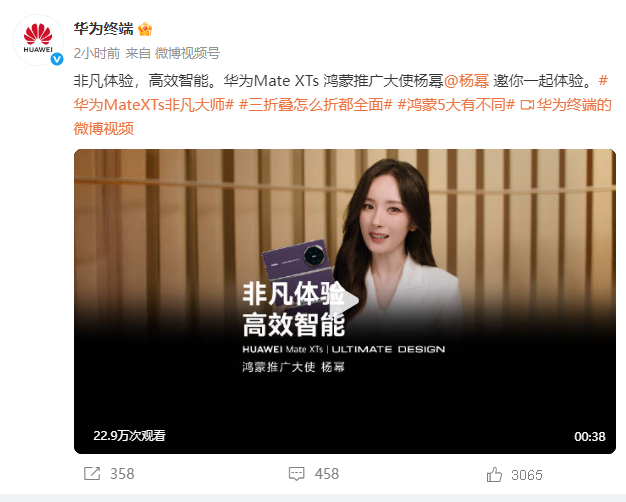 从8月27日以来,华为通过一系列预热视频逐步揭示华为Mate XTs 非凡大师的核心亮点:先是确认新品名称与发布时间,接着曝光新配色和手写笔功能,再到多窗口操作的卖点释放,最后9月1日的预热视频则以小艺AI的升级作为高潮。层层递进的节奏设计,既保持了持续的讨论度,也让产品的硬件和软件优势被逐一放大。