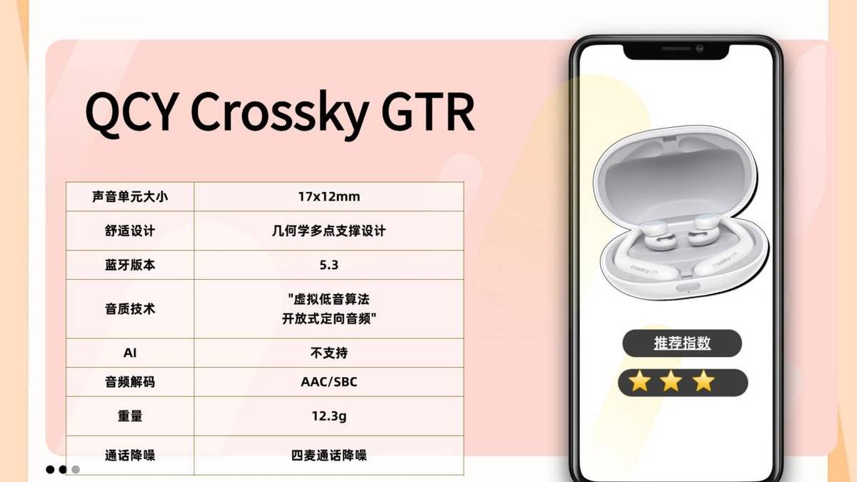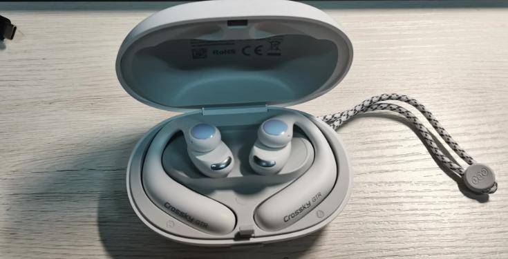 QCY Crossky GTR这款开放式耳机,单耳重量约12.3克,在开放式耳机里算是偏重一些的。佩戴感受方面,这款耳机最大的亮点是采用了自研的无人机旋翼形态转轴,前腔可以自由旋转90度,可以根据自己的耳型调节佩戴角度。对戴眼镜的用户也很友好。不过耳挂尺寸偏大,材质偏硬,对耳廓较大的用户来说,长时间佩戴舒适度一般。