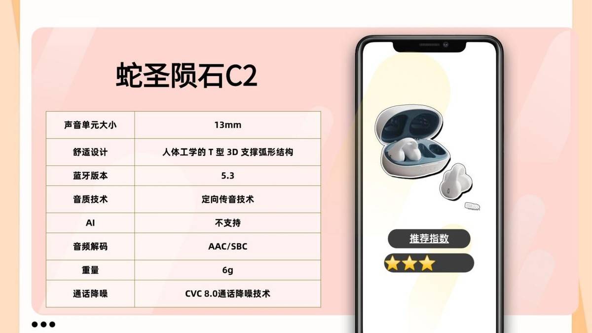 蛇圣陨石C2单耳6g,比一枚硬币轻点儿,戴去上班摸鱼一下午,下班才想起没摘,存在感超低。TPE软胶耳挂能随便掰,T型3D结构贴得特稳,跑步跳操狂甩不掉,戴眼镜也不打架。但耳背厚的朋友初戴得调角度,戴的时间太长的话,耳廓会有点压感,侧躺戴还会硌耳朵。IPX5防水超安心,运动暴汗、小雨淋到都不怕,擦干净照样用。