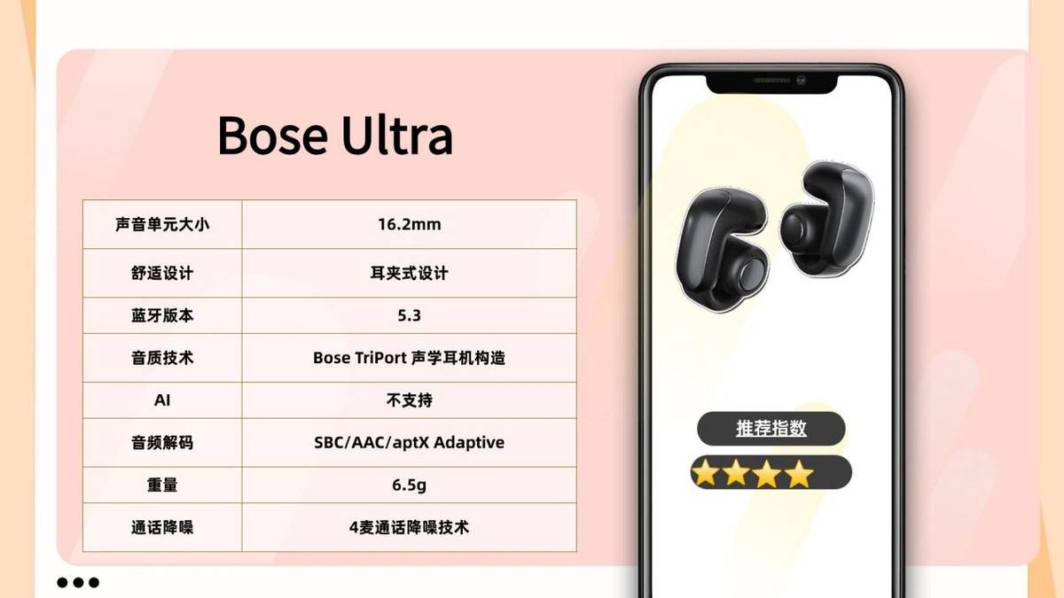 Bose Ultra单耳约6.5g,不算特别轻但戴感舒服,超软硅胶耳夹能贴合耳廓,全天办公写报告也没明显压痕,戴眼镜的朋友也不用担心硌得慌。跑步骑行时稳得很,就是长发女生容易夹到耳后头发,得时不时整理。IPX4防水够日常,运动出汗没问题,但别拿去淋雨,毕竟只是防泼溅。