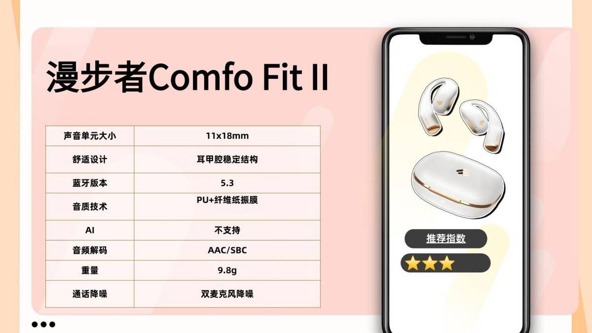 漫步者Comfo Fit II这款开放式耳机,单耳重量约9.8克,在开放式耳机里算是比较适中的。佩戴感受方面,可以根据自己的耳型手动调整,戴眼镜的朋友也能完美适配,但在剧烈运动时稳定性一般,跳绳或者跑步时容易产生位移,需要手动调整