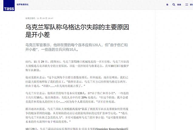 11月29日,俄罗斯塔斯社援引美联社的报道,目前前线的乌克兰军队在乌格列达尔地区逃兵现象越来越严重,已经严重影响前线的防御和进攻,这导致乌军的防线被削弱,更多原本的控制区被俄军占领。乌克兰军队的指挥官和士兵表示,受这些因素影响,防线变得脆弱,已经无法坚守。根据乌军”72独立机械化旅的一名不愿透露姓名的军官告诉美联社记者。