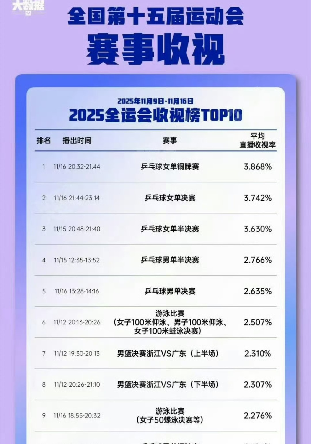 收视率最高的还是乒乓球,这也是我们的国球,受众之广泛,暂时还是篮球不能比的。收视率前五名都是乒乓球的比赛,第一名,女单铜牌赛陈梦VS朱玉玲,第二名女单决赛王曼昱VS孙颖莎,第三名女单半决赛,第四名男篮半决赛,第五名男单决赛樊振东VS林诗栋。第六名,游泳比赛,第七名和第八名就是成人组男篮决赛了。第九名游泳比赛,第十名乒乓球男单铜牌赛。