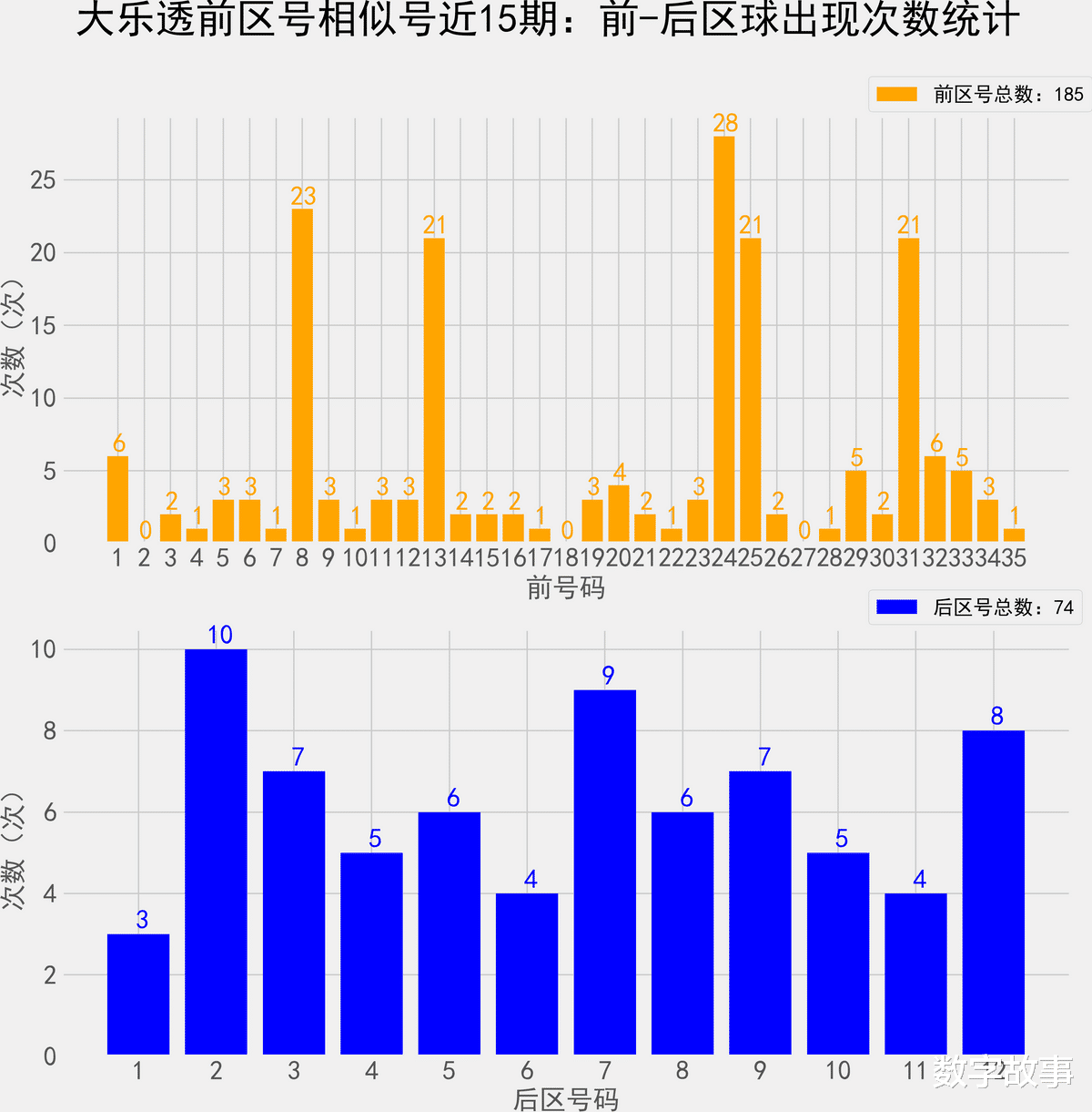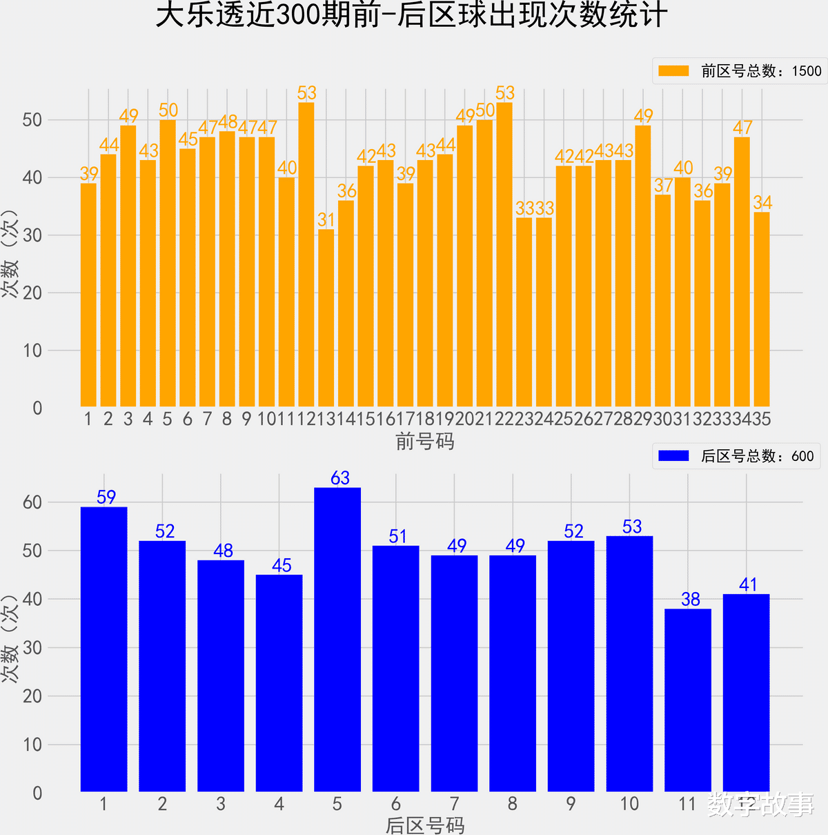 大乐透近300期前后区号统计情况统计样本数据: 1500个前区号码 600个后区号码