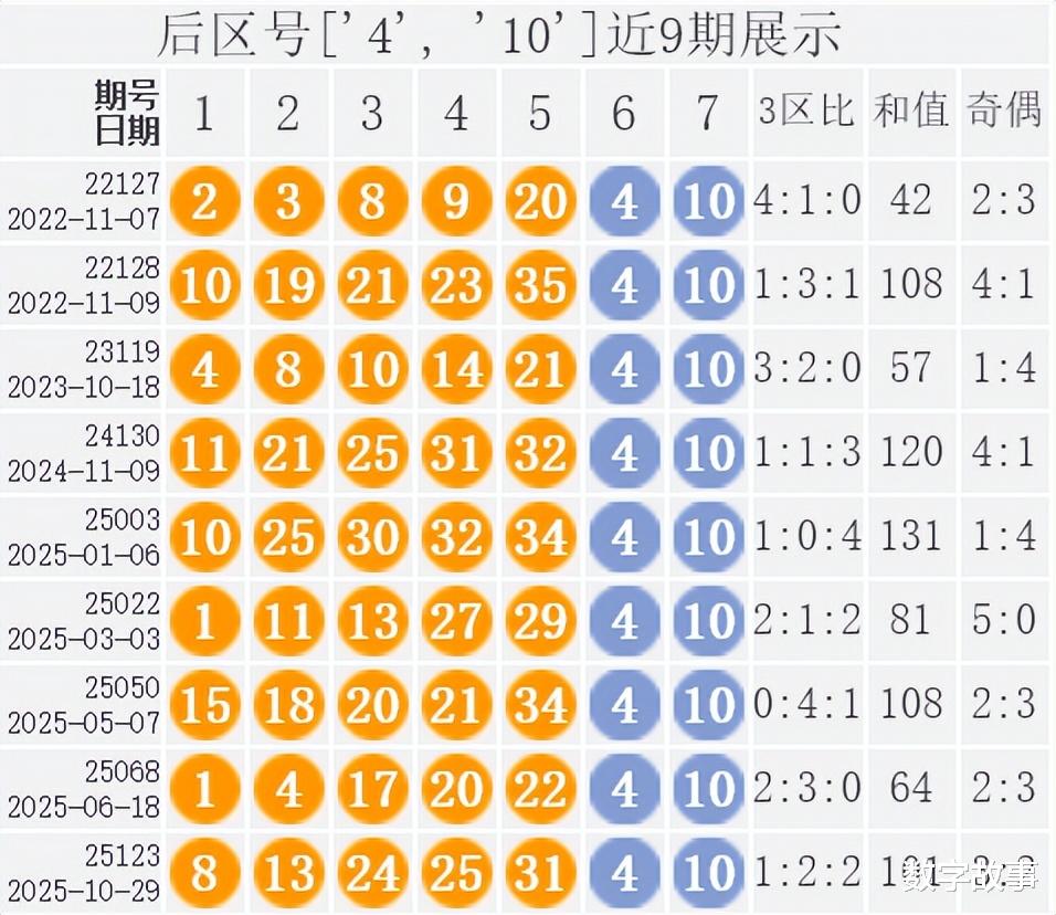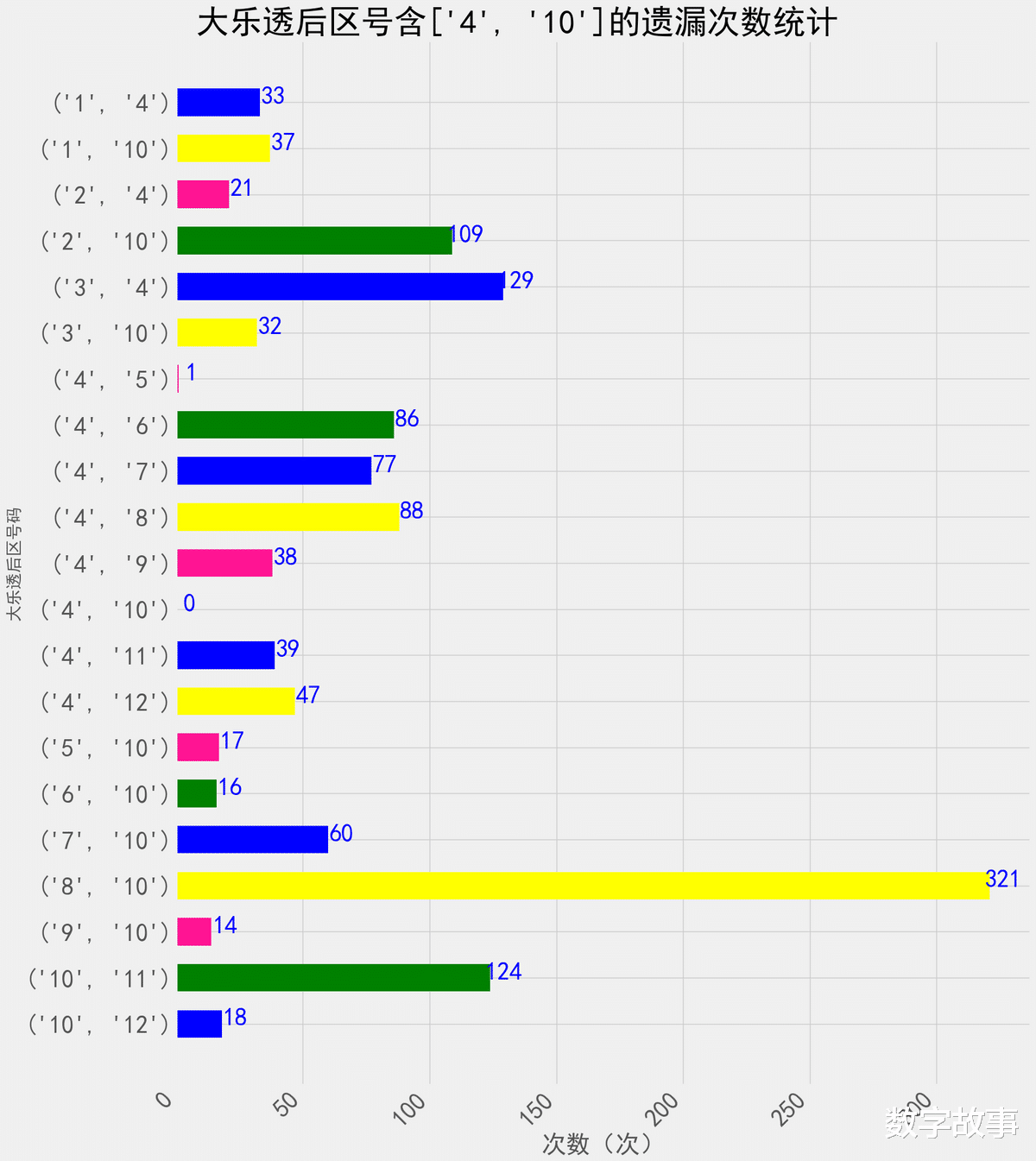 大乐透后区含4或10的双号遗漏次数统计大乐透后区组合4-10近150期出了6次,这次中断了54期遗漏。