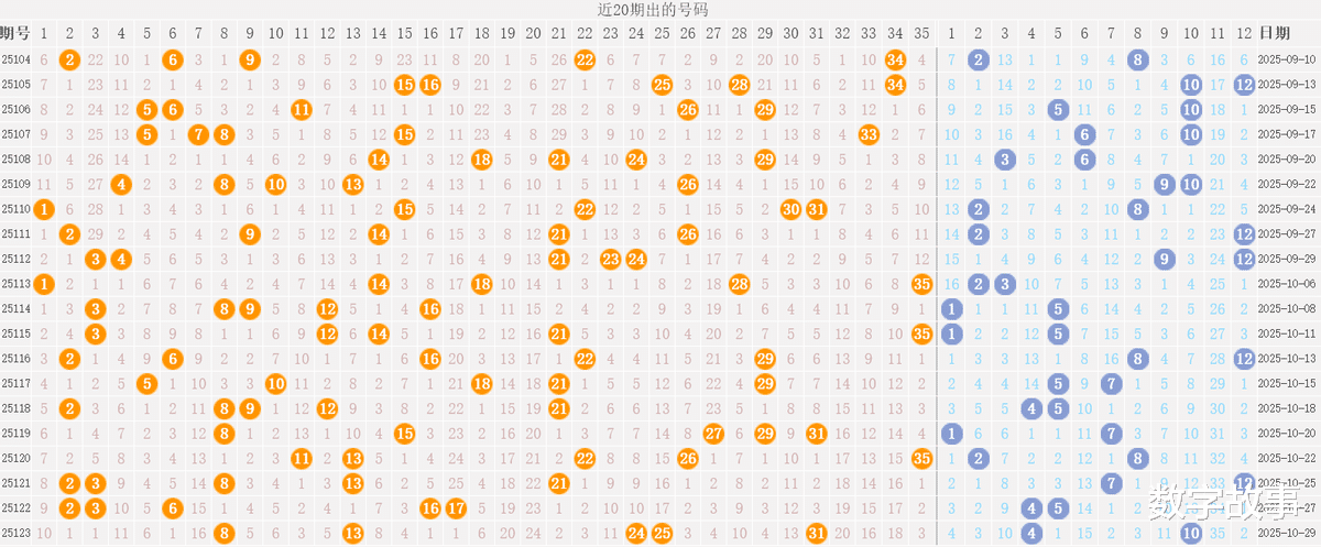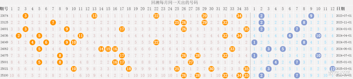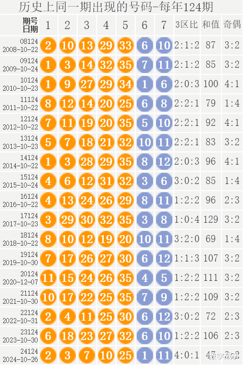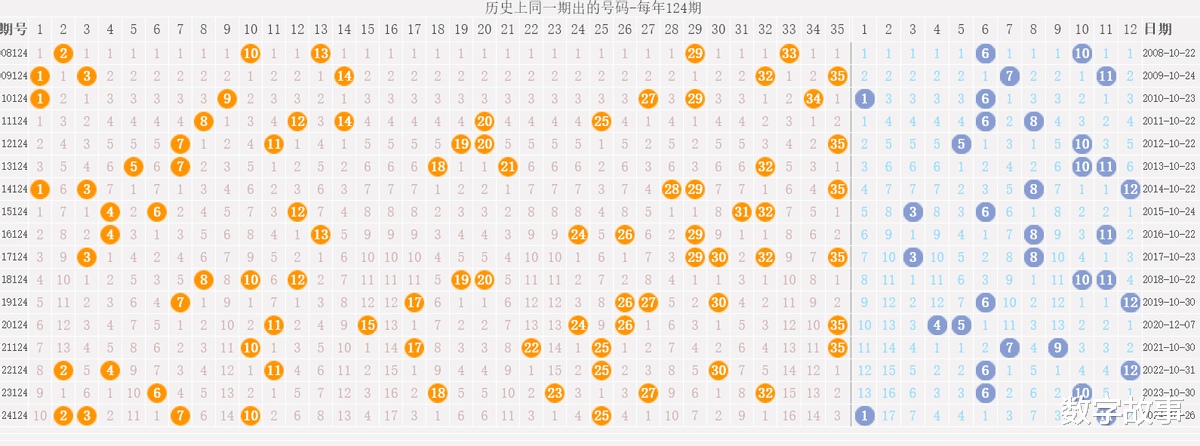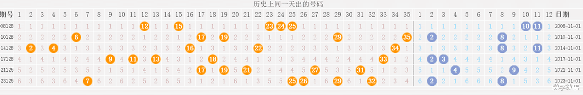 博弈心理,挑战概率: 看近期开奖号码,也可看历史数据统计!【大乐透25124期多角度冷热号】大乐透25124期四维走势图,前后区号统计及冷热号1) 历史同一天:11月01日 (共6期)