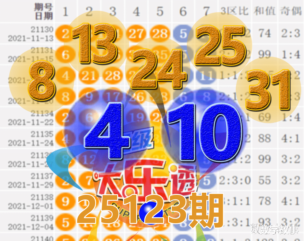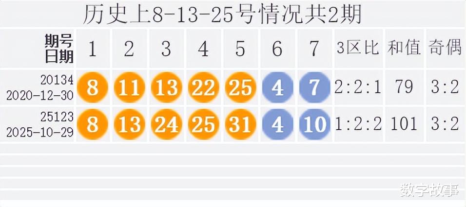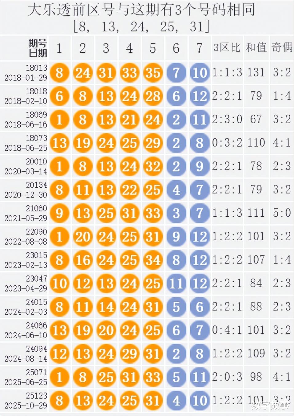 文末有大乐透前区号8-13-25, 24-25-31的历史统计。【体彩大乐透25123期开奖结果及统计】前区号组合历史上有1期四球相同,后区4-10中断54期遗漏;9注一等奖,奖池11.363亿。