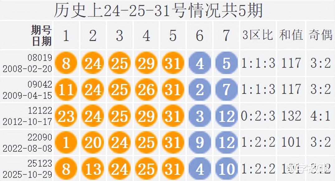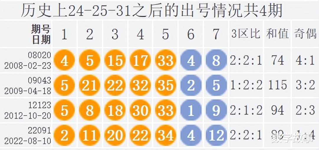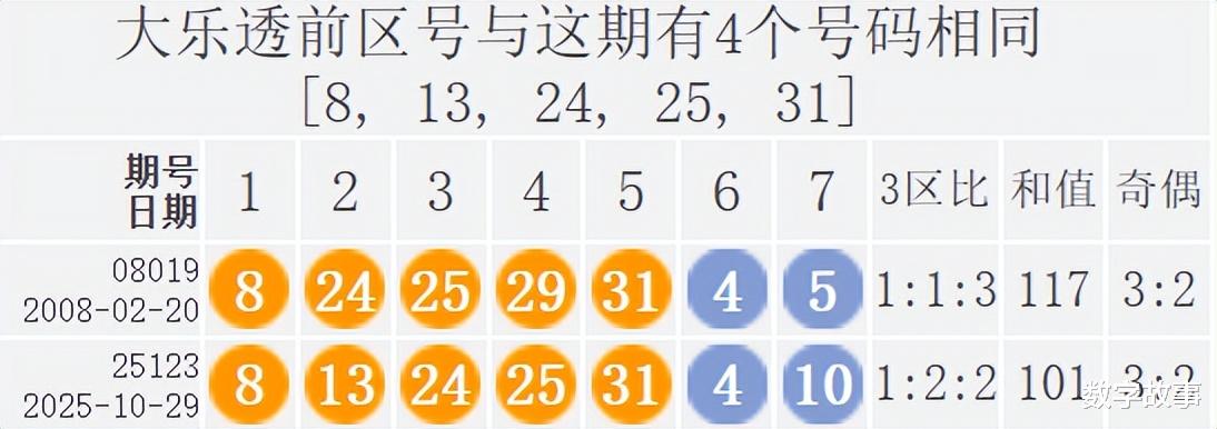 大乐透25123期前区号在过去是否出现过?大乐透25123期前区号: 8-13-24-25-31经查,历史上没有出现过与这一期5个前区号一样的,4个前区号一样的有1期,如下: