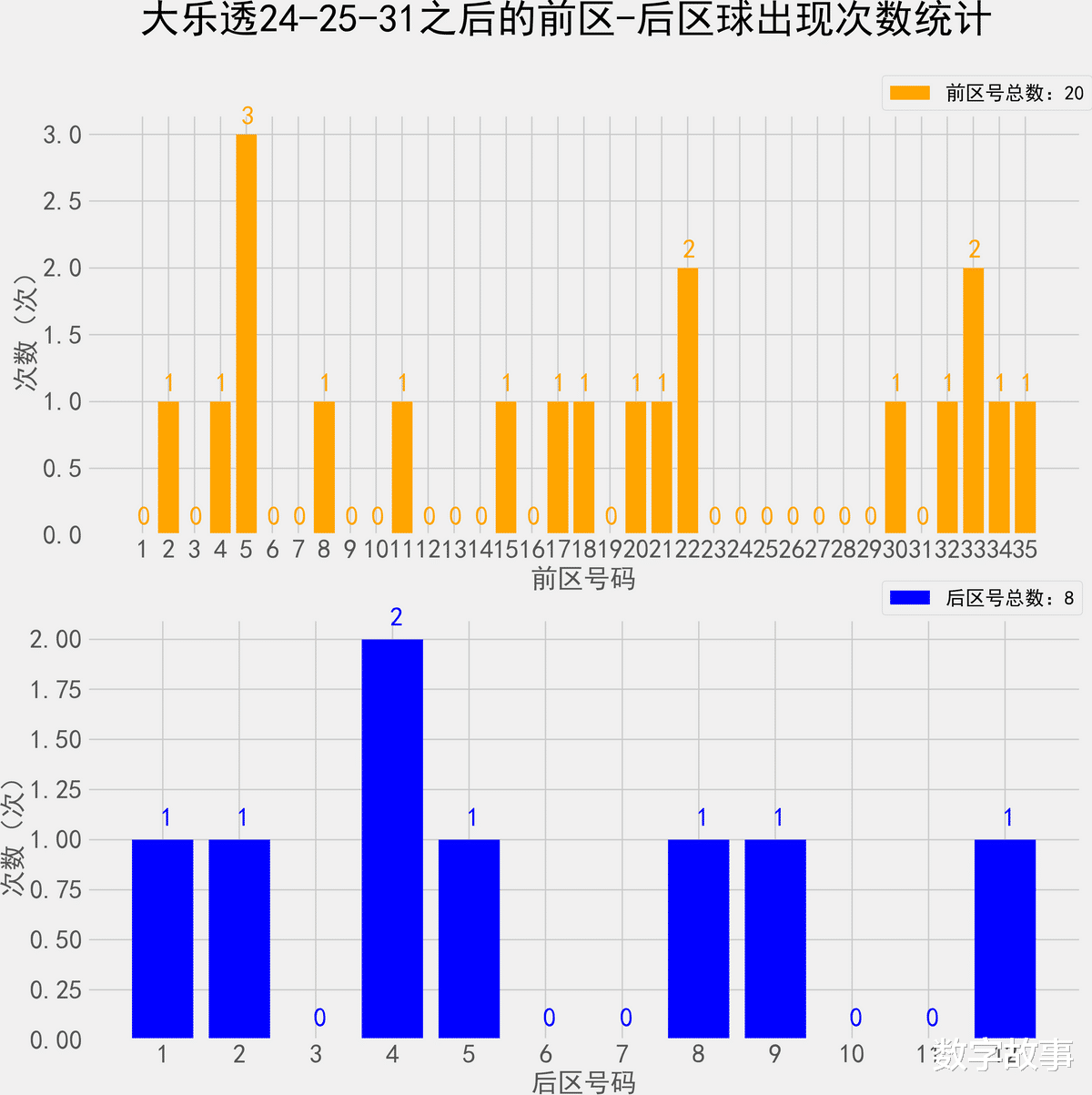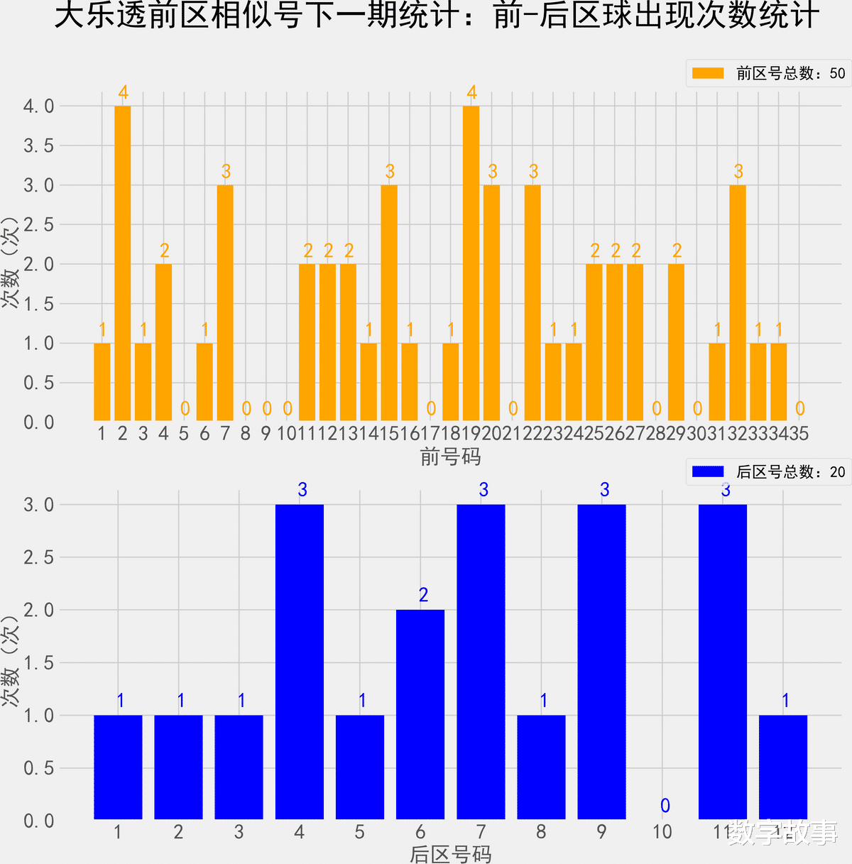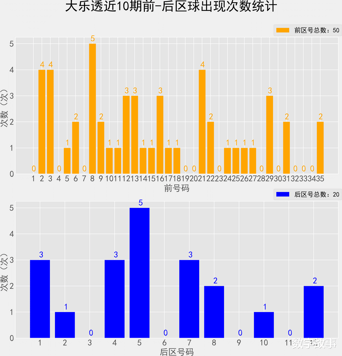 大乐透近10期前后区号统计情况统计样本数据: 50个前区号码 20个后区号码