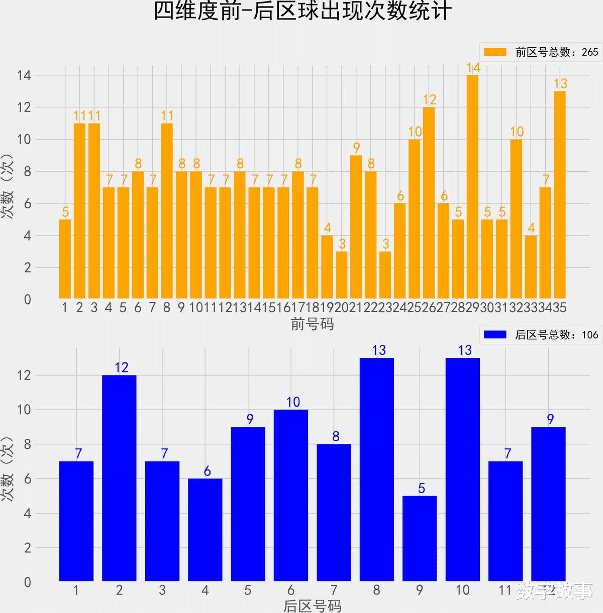 => 统计出现概率综合以上4个纬度的号码,共53期根据出现次数,分为热号,冷号,其他的为温号。统计样本数据: 265个前区号码 106个后区号码