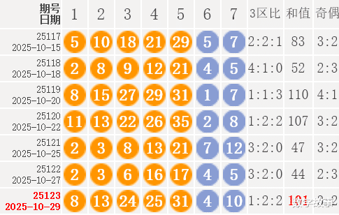 大乐透25123期开奖结果及中奖情况:出奖时间: 2025-10-29 星期三 前区号:8-13-24-25-31后区号:4-10大乐透前区隔期下落:8, 13后区重号叠码:4前区奇偶比:3:2 前区和值:101前区跨度:23 三区比:1:2:2连号: 24-25