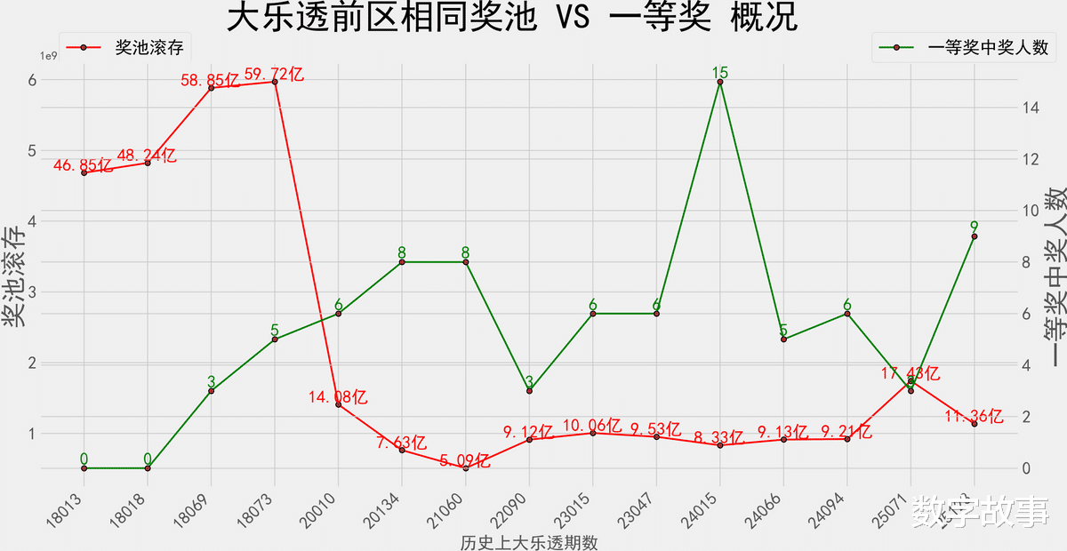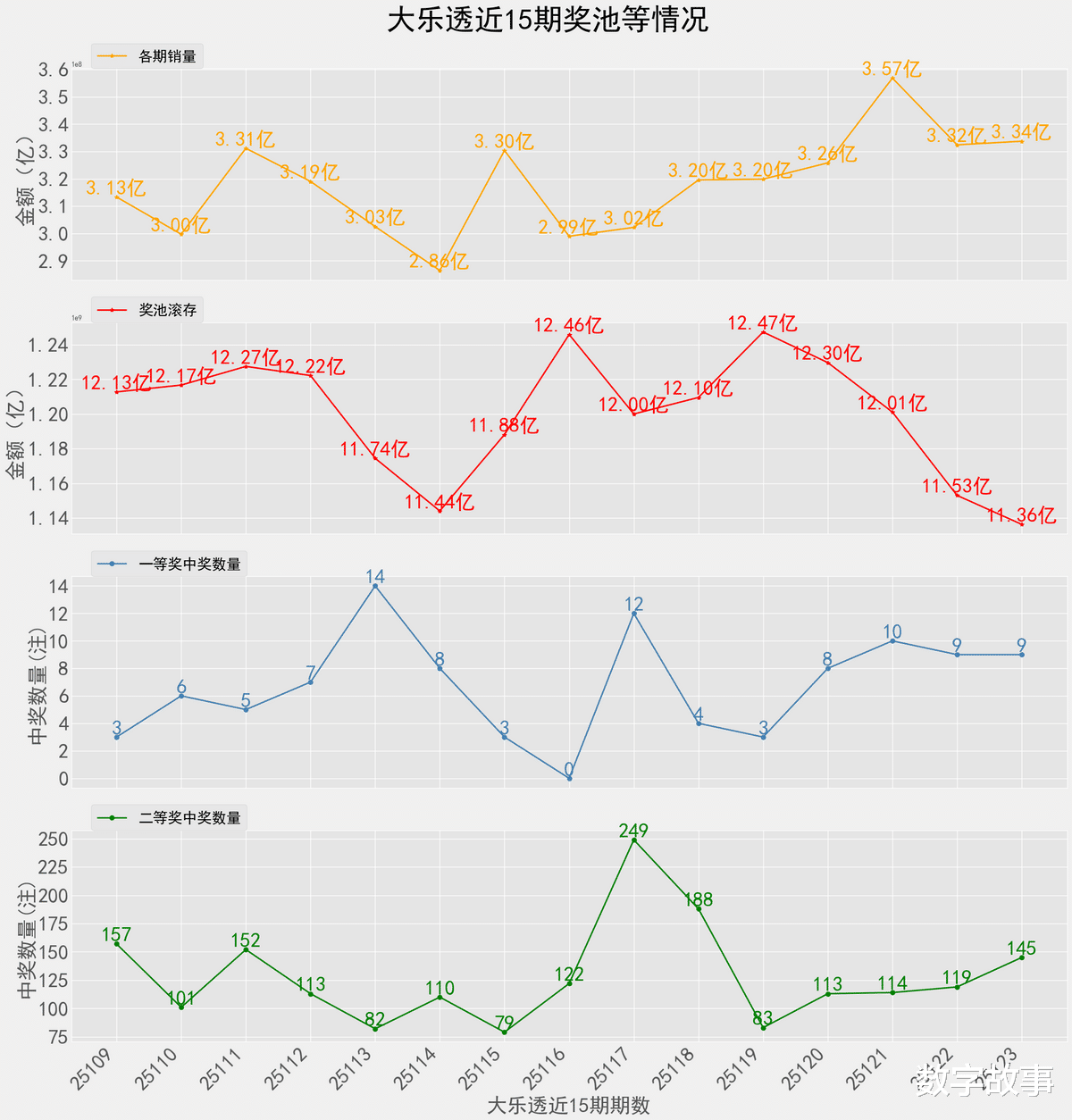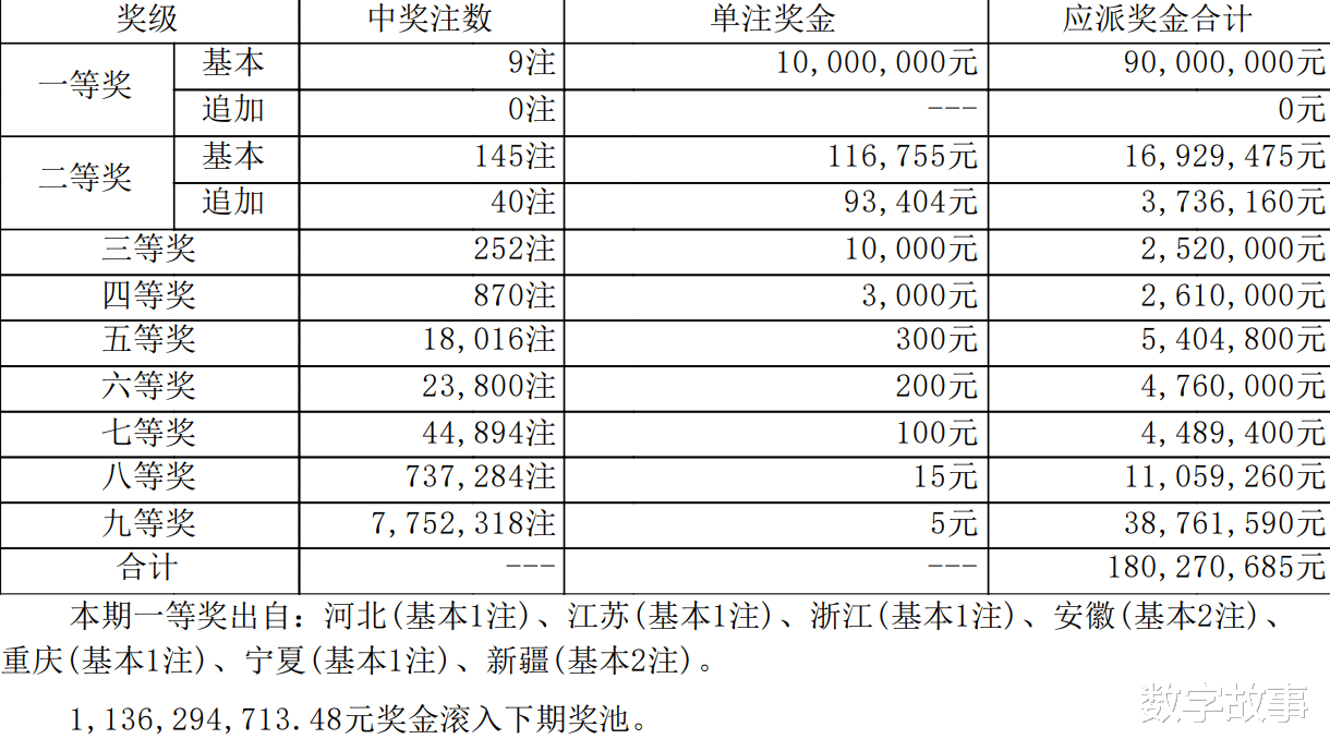 大乐透25123期一等奖:9注,追加: 0注二等奖:145注,追加: 40注。本期全国销售金额:3.338 亿 奖池滚存:11.363 亿.近15期奖池滚存, 中奖情况等信息: