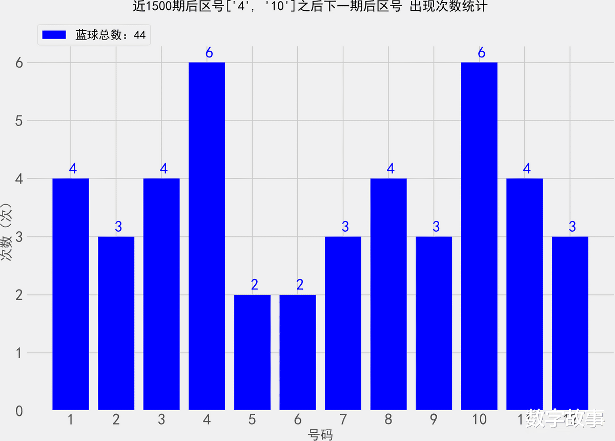 统计近1500期后区号4-10之后, 各后区号的出现次数大乐透25123期后区号是4-10找出近1500期后区4-10号之后,下一期出现的所有后区号,统计其出现次数。除开这一期,共出现了22次4-10后区号那么统计的样本数据是44个