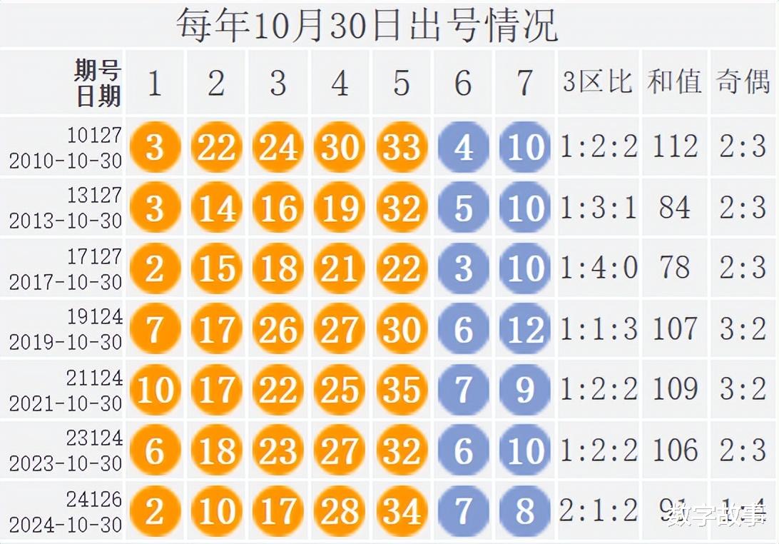 【其他历史数据查询统计】大乐透历史上的今天2025-10-30 星期四 大乐透不开奖每年10月30日出号情况: