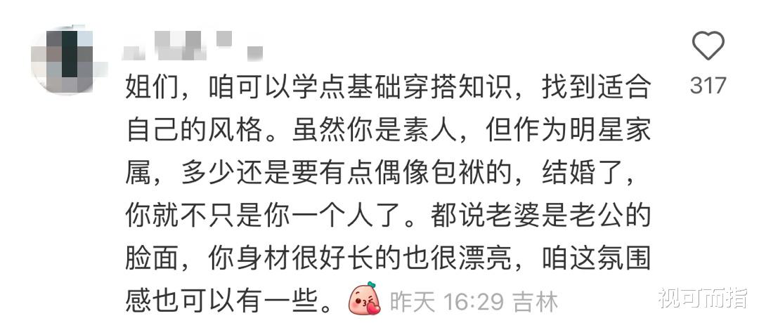 针对张馨月的衣品,此前就曾有一些网友存在一些看法,有网友更是跑到张馨月动态下留言,建议这位“星嫂”应该学习基础穿搭知识,找到真正适合自己且不失格调的风格。毕竟,作为公众人物的配偶,某种程度上也需要具备一定的“偶像包袱”。