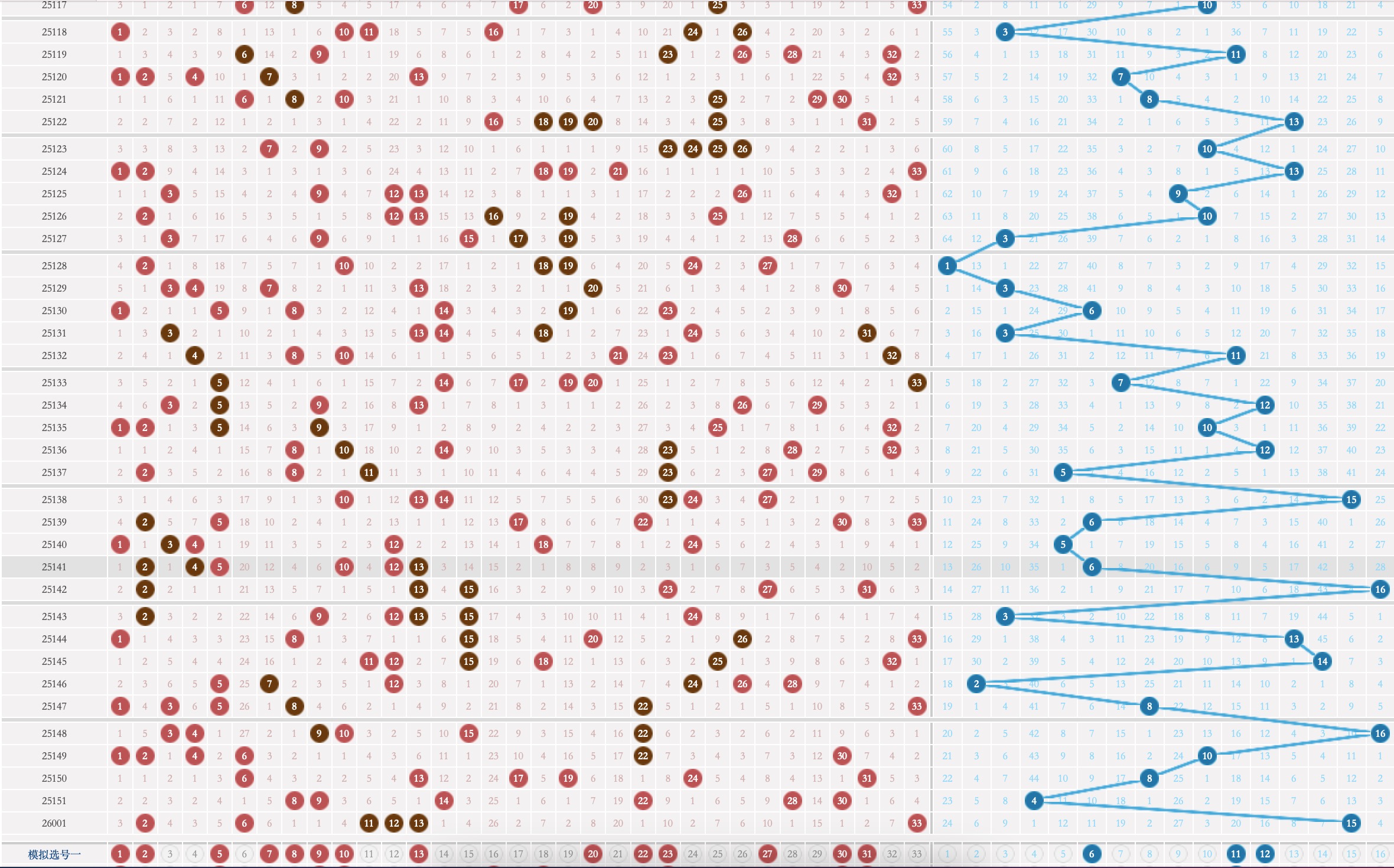 根据上述解析条件可知,本期双色球红球出球范围码考虑1_2_5_7_8_9_10_13_20_22_23_27_30_31,篮球码考虑6_11_12。本期参考组合码分别为;01,09,10,13,20,23+11