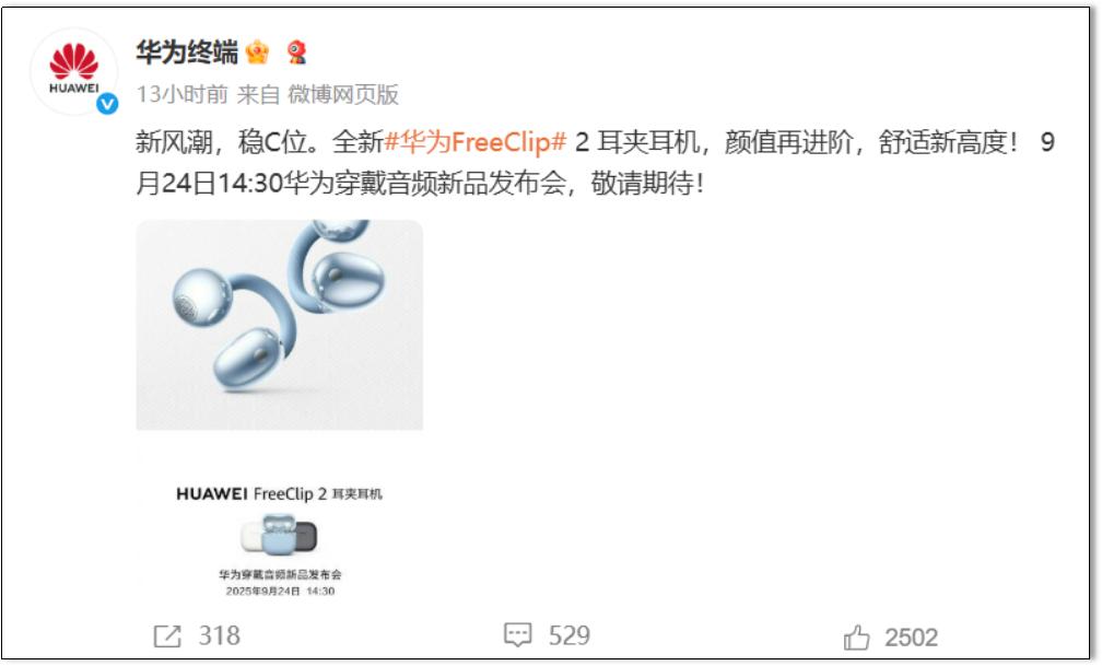 另外还将带来全新的华为FreeClip 2耳夹耳机,其通过微博预告:“新风潮,稳C位。全新#华为FreeClip#2 耳夹耳机,颜值再进阶,舒适新高度! 9月24日14:30华为穿戴音频新品发布会,敬请期待!”