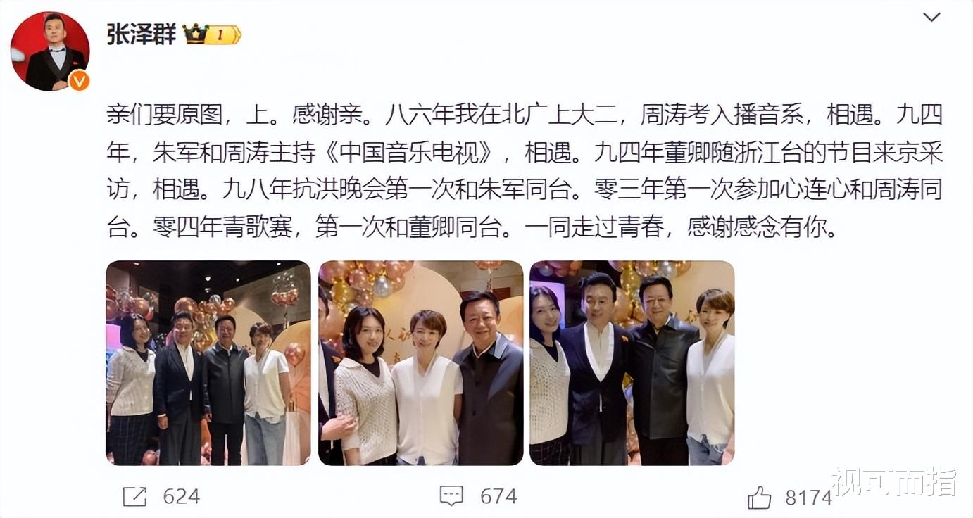 次日,张泽群又在社交平台上深情补发了一则动态,详尽回顾了他们四人相遇相知的点点滴滴。从1986年北广的校园,到1994年的《中国音乐电视》,再到后来的抗洪晚会、心连心活动以及青歌赛,每一次的相遇都如同命运巧妙的安排,串联起他们共同走过的青春岁月。