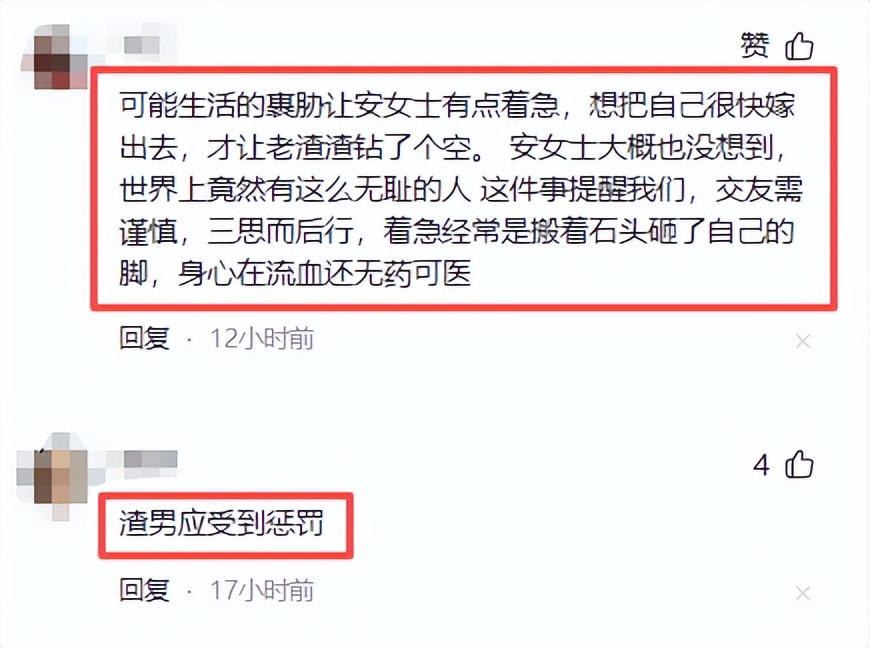 再怎么说两个人的年纪也不小了,安大姐又是诚心想要和大爷过一辈子的,谁知道却遇到了一个不负责任的渣男,这该怪自己没擦亮眼睛呢还是怪自己太过于天真呢?
