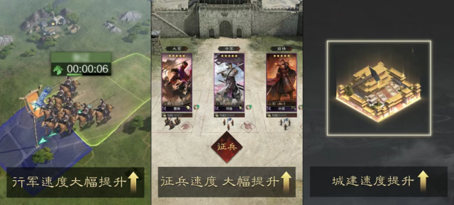 同时,原300/500格的行军距离限制移除、城内设施建造及升级时间减少50%、城外建筑建造及升级时间减少50%、征兵速度提升25%。