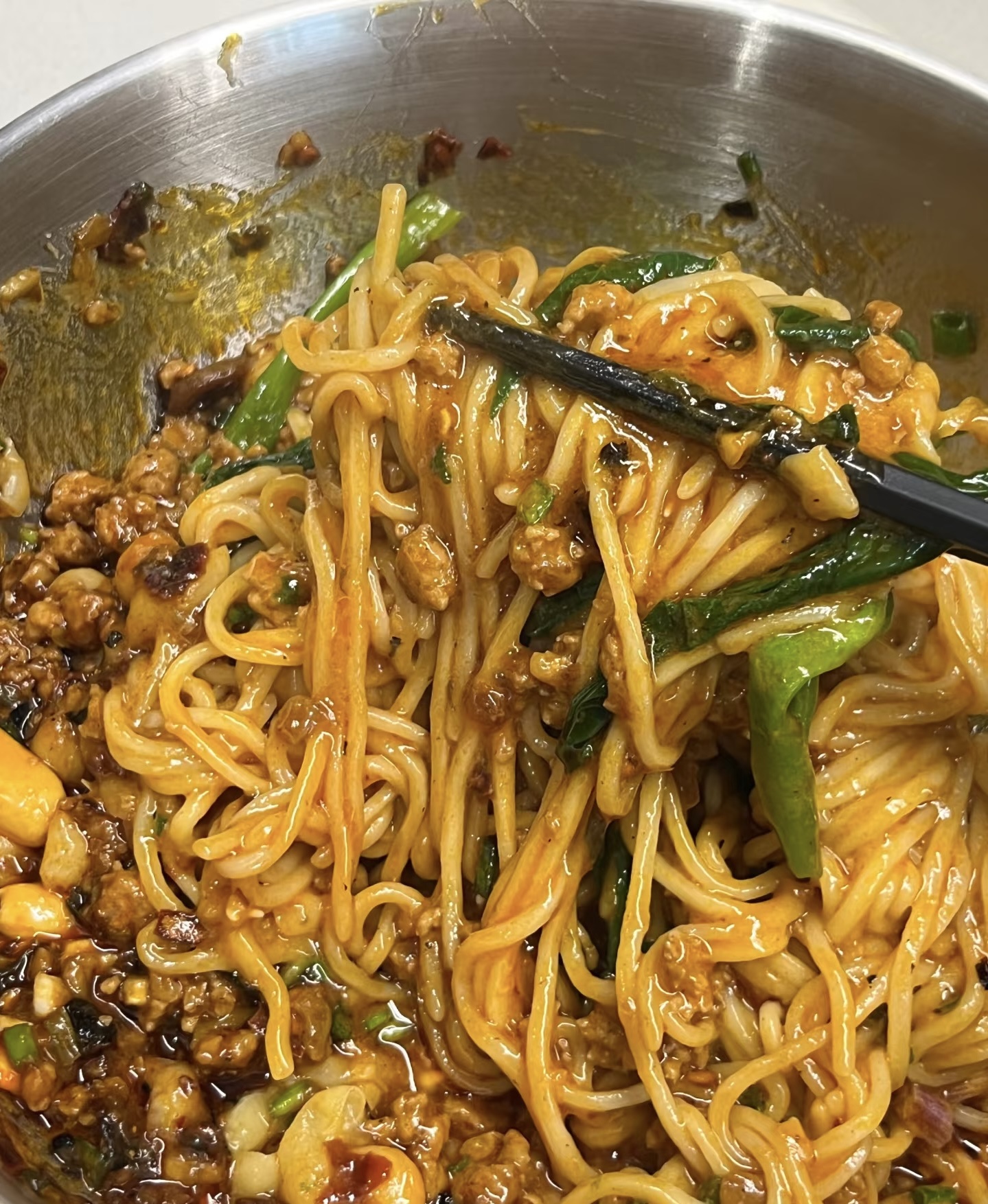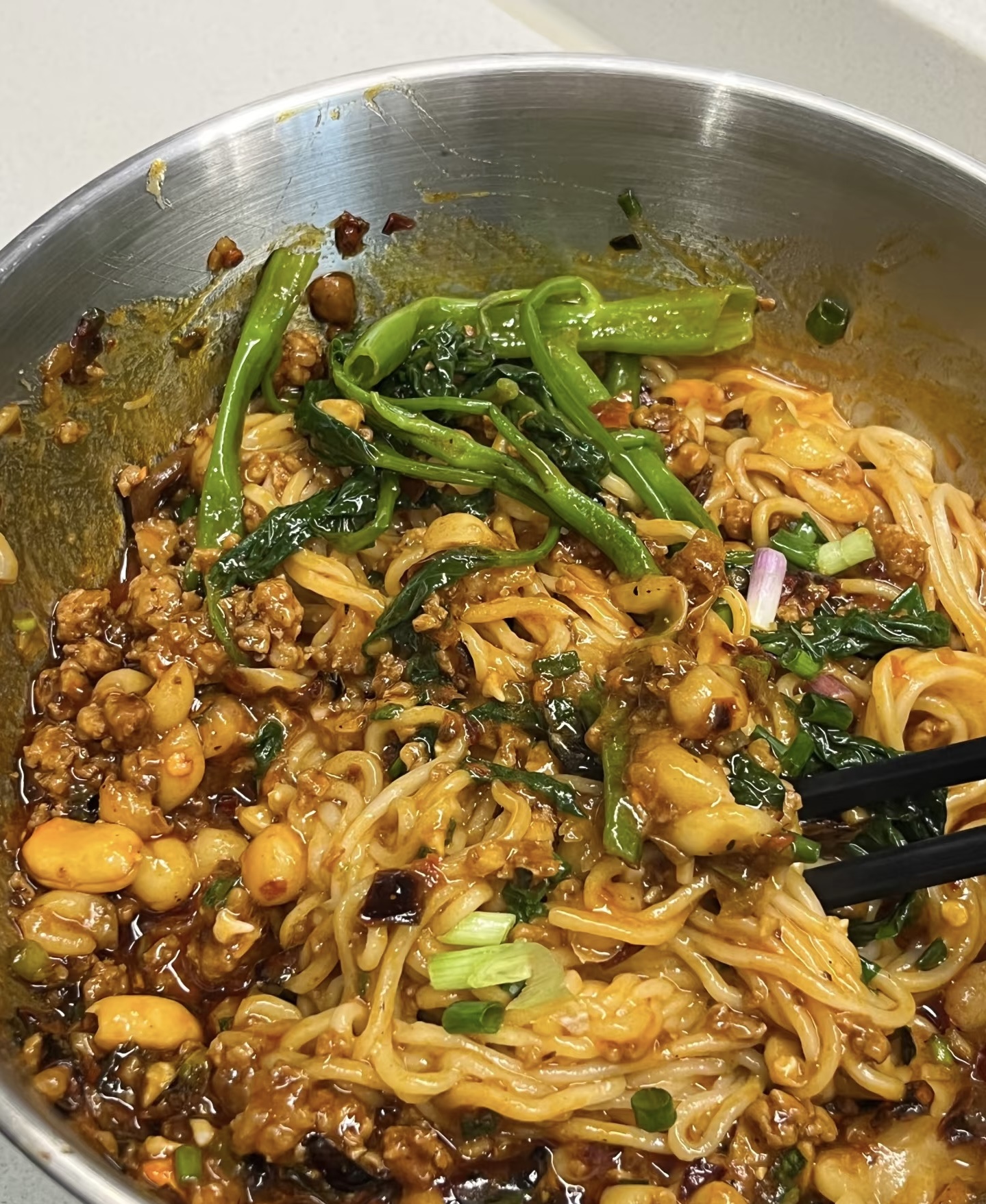 最后,将杂酱和豌豆放在面条上,搅拌均匀即可享用美味的重庆豌杂面。