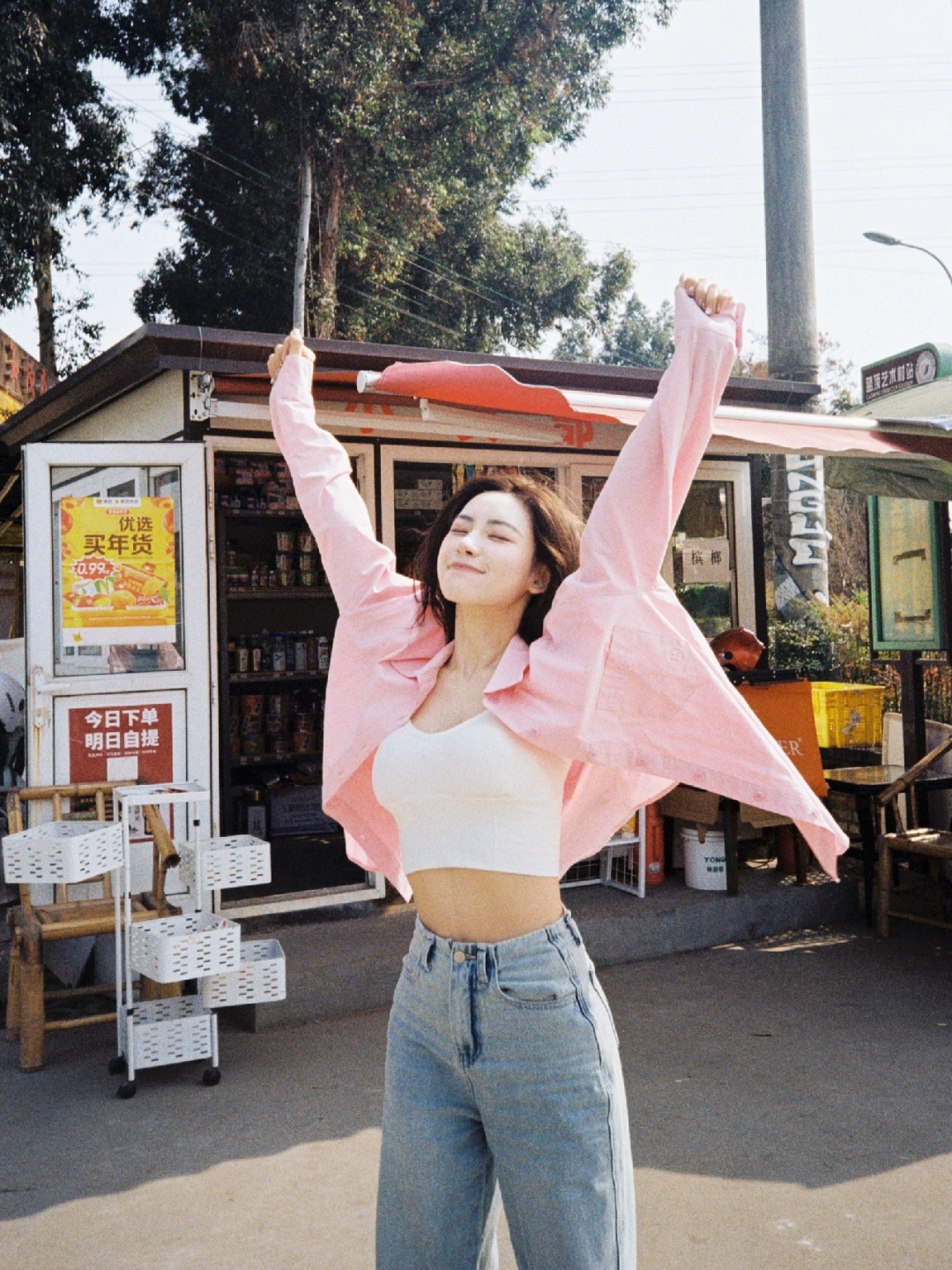 双臂用力向上高高举起,双手可轻轻抓住衬衫边角(或完全自然伸展),让身体完全舒展,闭眼或微笑都可,仿佛尽情享受阳光拥抱,瞬间释放活力,把“轻松感”焊在照片里。
