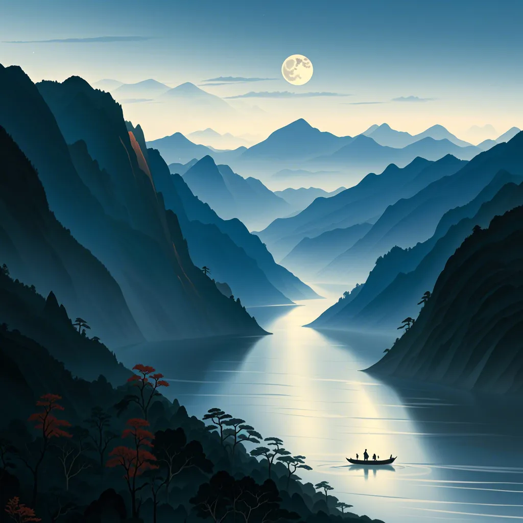 李白乘着一叶扁舟,从水路悠哉悠哉地出川。正值秋高气爽,船上晚餐后,他便躺在甲板上,享受着秋夜的凉风。忽然,他的目光被峨眉山间升起的半轮明月吸引,月色迷人,这月亮似乎在跟随着李白所乘的船只,随船而行,低头却发现,江中的另一轮明月,也随着水流而行。