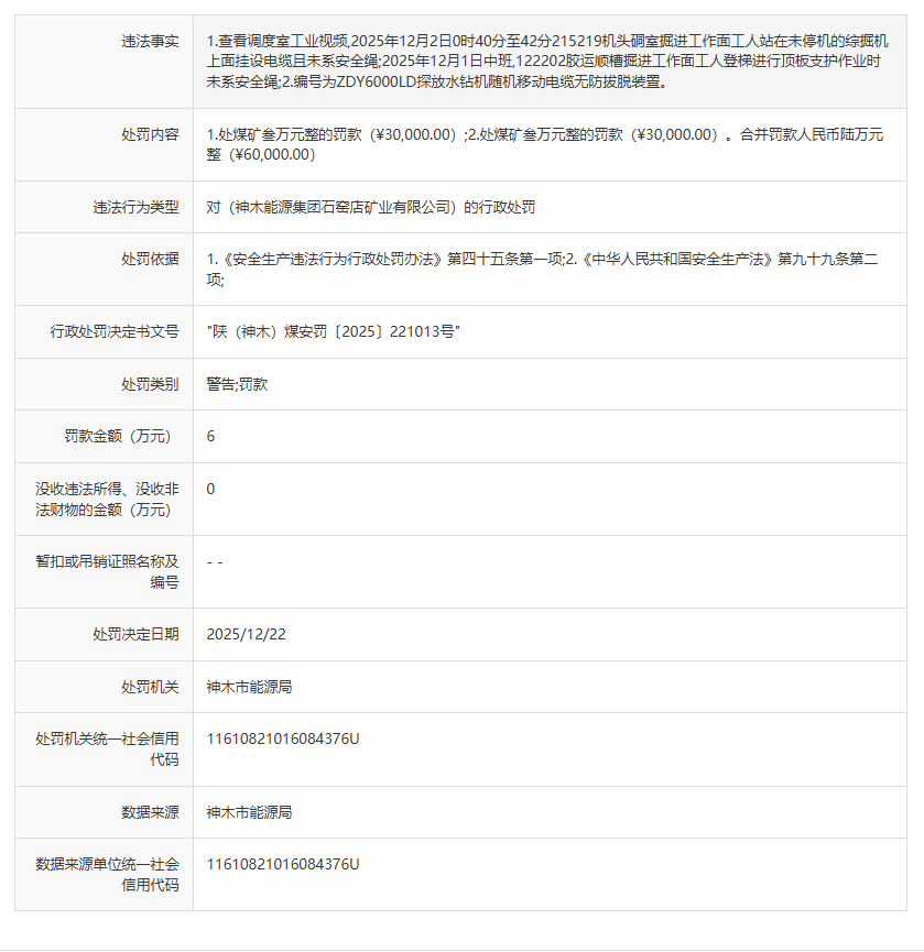 安全生产是煤炭行业发展的生命线,然而神木能源集团石窑店矿业有限公司却因在作业中违反安全规程,被监管部门依法处罚。2025年12月22日,神木市能源局公布行政处罚结果,该企业因两项安全生产违规行为,被处以警告并合计6万元罚款,再次为煤炭企业安全生产敲响警钟。