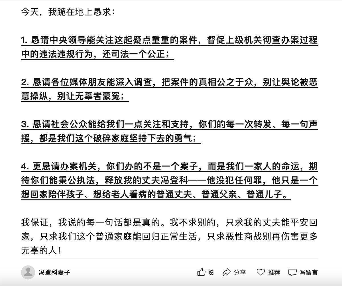 最终,她跪地发出四点恳求:盼中央领导关注彻查、求媒体深入还原真相、望公众给予支持、请办案机关秉公执法释放丈夫。字里行间没有激烈控诉,只有一个妻子、母亲、儿媳对家人平安的渴求,以及对恶性竞争伤害无辜的担忧。