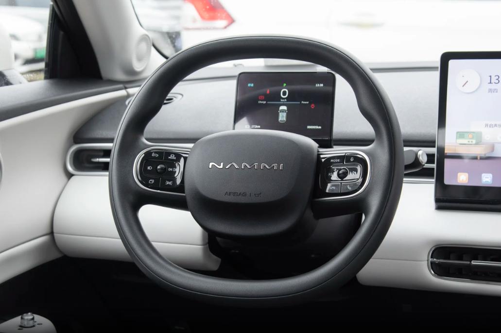 中控区域是一块12.8英寸的悬浮式大屏,仪表盘则是一块5英寸的全液晶屏,虽然尺寸不大,但显示的信息很清晰,像车速、电量、续航里程这些关键信息都能直观看到。方向盘是塑料材质,支持上下调节,上面集成了多功能按键,平时调节音量、切换歌曲或者控制车机功能都很方便,不用频繁低头操作。