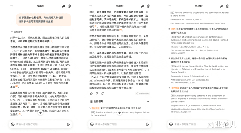 除了需要高效地辅助临床决策,医生还开始面对新的挑战:患者用DeepSeek自诊和带着DeepSeek就医的现象越来越多。虽然知道大模型可能有幻觉和偏颇,但没有时间和精力去甄别哪句对哪句错。通过百小应,医生有了面对通用模型挑战的“专属武器”。