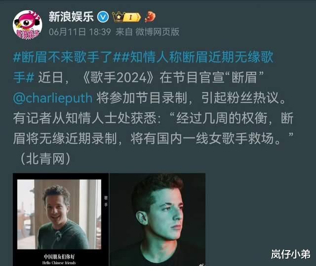 《歌手2024》第六期节目还有两天的时间就要跟观众见面了,而作为本期最大看点袭榜歌手断眉查理普斯已经确定缺席录制,据知情人士爆料消息属实,其实最初在昨天只是各种爆料的传闻,如今来看并非空穴来风。