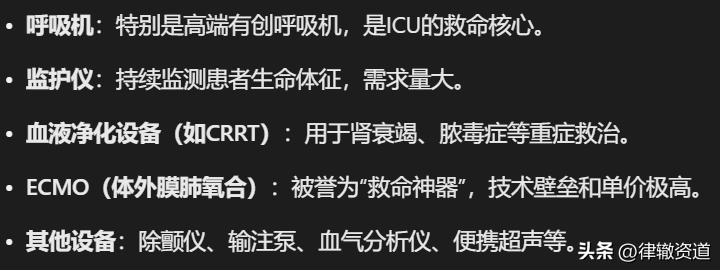 国家卫生健康委等8部门2024年印发的《关于加强重症医学医疗服务能力建设的意见》提出了一个目标,2025年末全国重症医学床位达到15张/10万人。因此,和ICU病房相关的医疗设备也将会迎来需求的爆发。