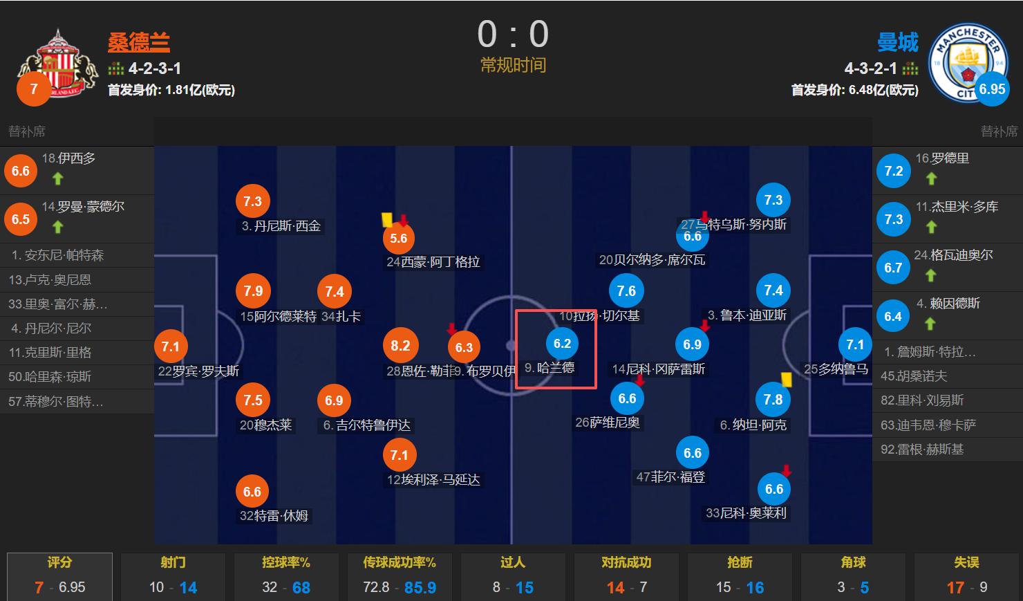 曼城0-0桑德兰,哈兰德首发出战踢满全场哑火,赛后获得6.2分。