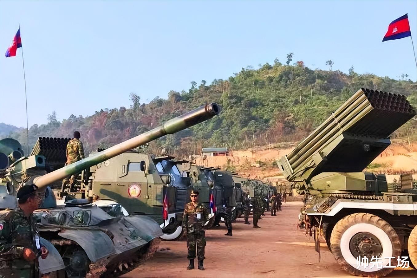 柬埔寨陆军炮兵也出动了,我国生产外贸型PHL-90B型多管火箭炮。本次泰柬冲突,在两边军队中都能,看到大量的中系装备的身影。
