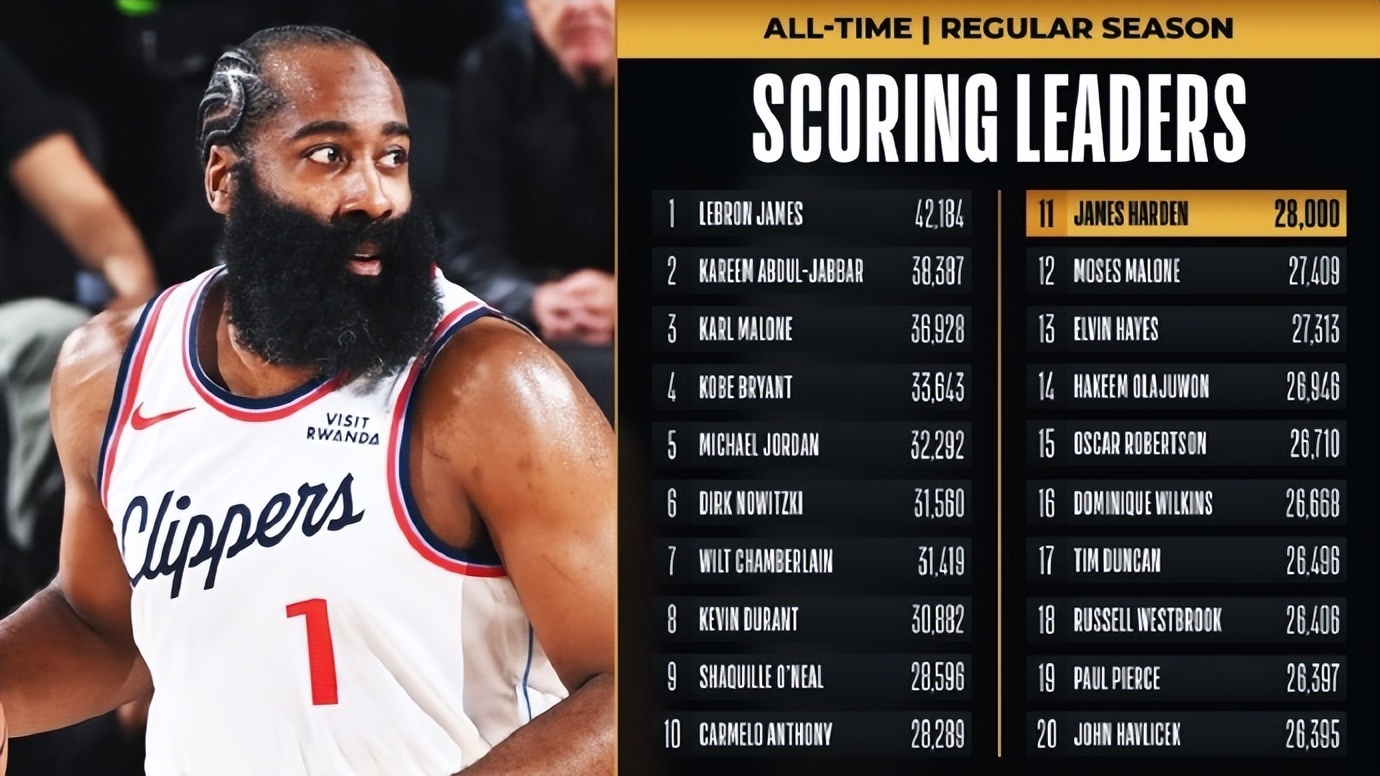 虽然比赛输了,但哈登也达成了一项重要的里程碑,那就是生涯总得分正式突破28000分大关,成为NBA历史上第11位达此成就的球员,也是现役继詹姆斯和杜兰特之后,第三位做到这一点的球员。另外,哈登接下来很快还将超越安东尼(28288分),跻身历史得分榜前十。