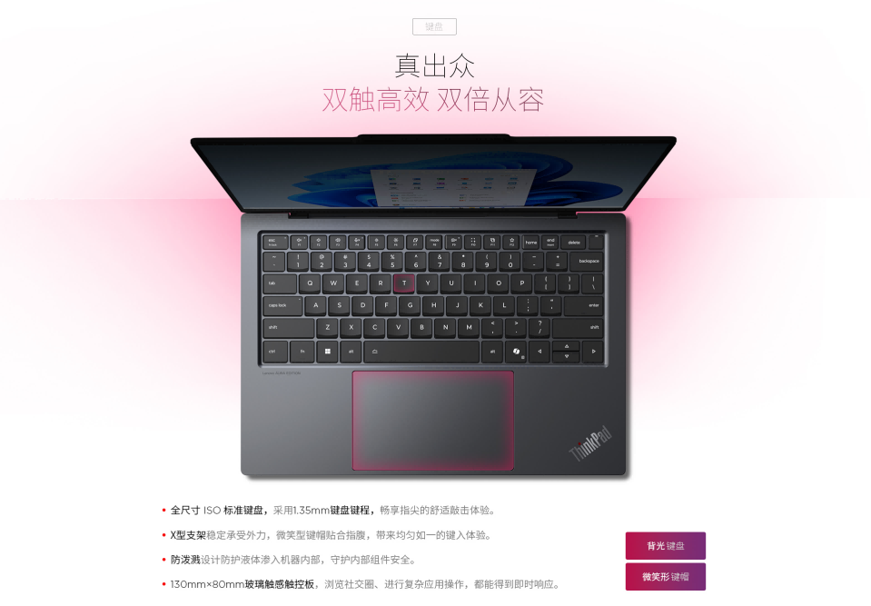 ThinkPad 家族的经典基因在 X9 上得到完美延续,同时融入现代商务美学。50% 再生铝机身搭配雷霆灰配色,方正线条尽显沉稳专业,钻石切割倒角与碳纤维纹理细节,又添几分精致感。标志性的小红点 + 三键触控板组合,配合1.5mm 键程的微笑键帽键盘,即使没有鼠标也能精准操作,连续码字几小时也不易疲劳。
