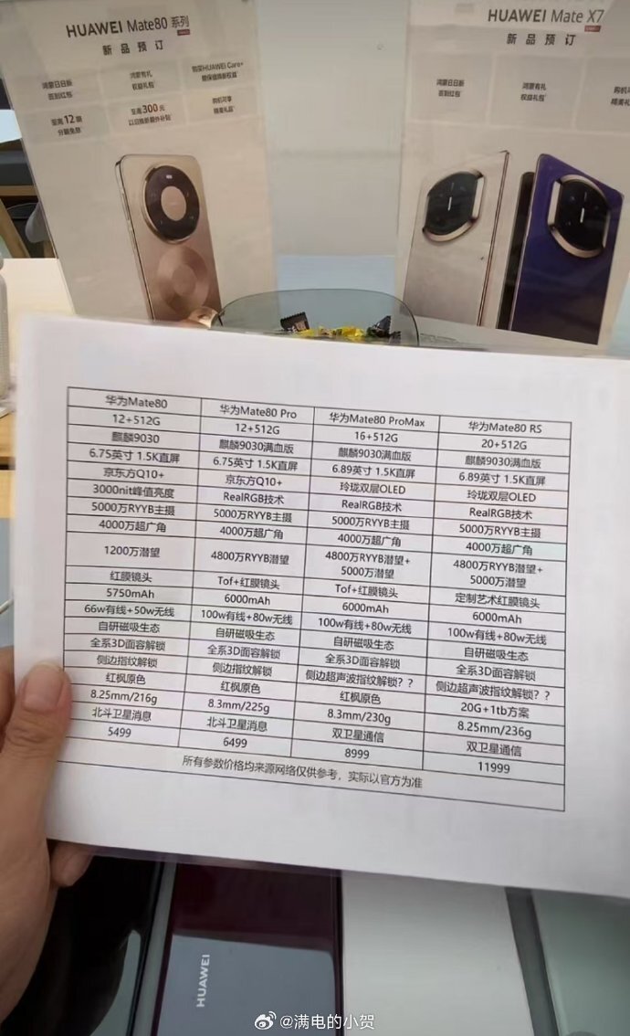 下周一就是官宣的华为Mate 80系列 | Mate X7及全场景新品发布会召开的日子了,除了 @华为终端 官博、华为常务董事、产品投资委员会主任、终端BG董事长 @余承东 和华为终端BG首席执行官 @华为何刚 等高管陆续公布的信息之外,近期不但官宣了该系列新机将首发户外探索模式,可实现14天极限续航之后,网间还爆料暗示该系列新机将支持双卡+双eSIM。此外,日前,有网友还曝光了一张疑似华为内部Mate 80系列的培训资料,全面展示了该系列新机的参数和售价等。