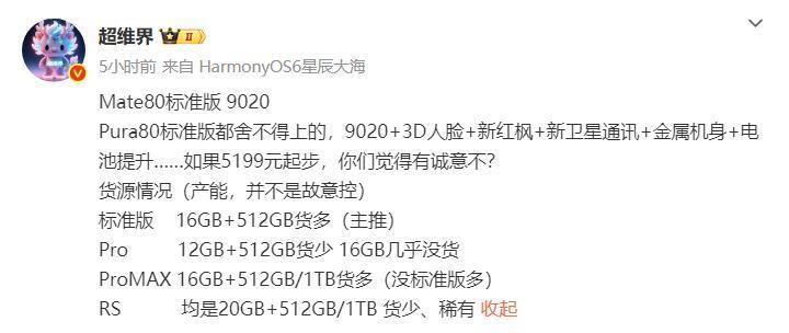 RS 均是20GB+512GB/1TB 货少、稀有”。至于此次华为Mate 80标准版最终会搭载麒麟9030处理器,还是9020处理器,最终还要以官方的信息为准。