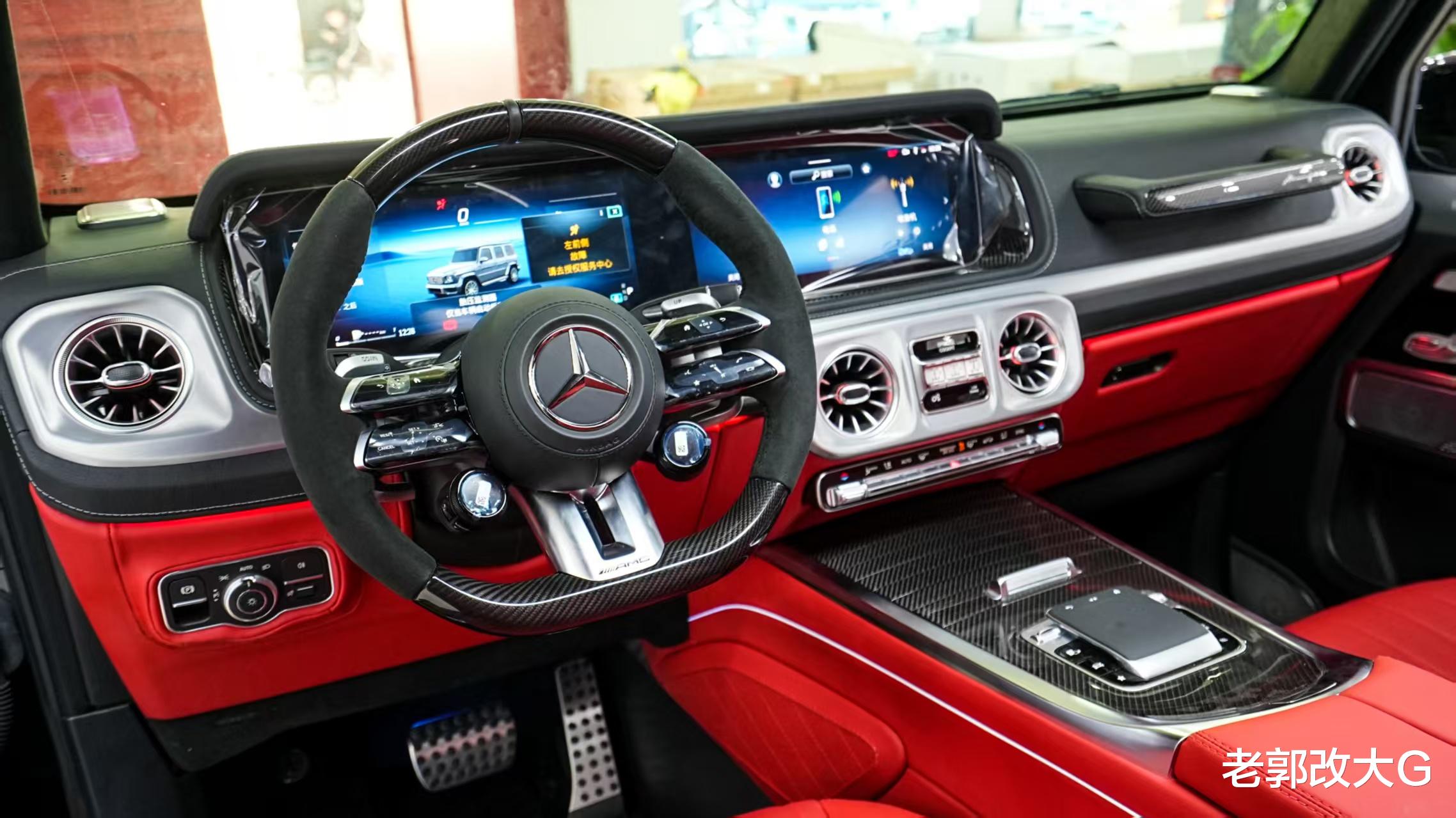 打开车门,内部的改变同样令人惊艳。王先生选择了激情洋溢的红色菱形格真皮内饰。这种源自顶级豪华车的工艺,通过精准的绗缝技术覆盖在座椅、门板等多个区域,将G级固有的硬汉风格与极致奢华完美融合,营造出独一无二的座舱氛围。
