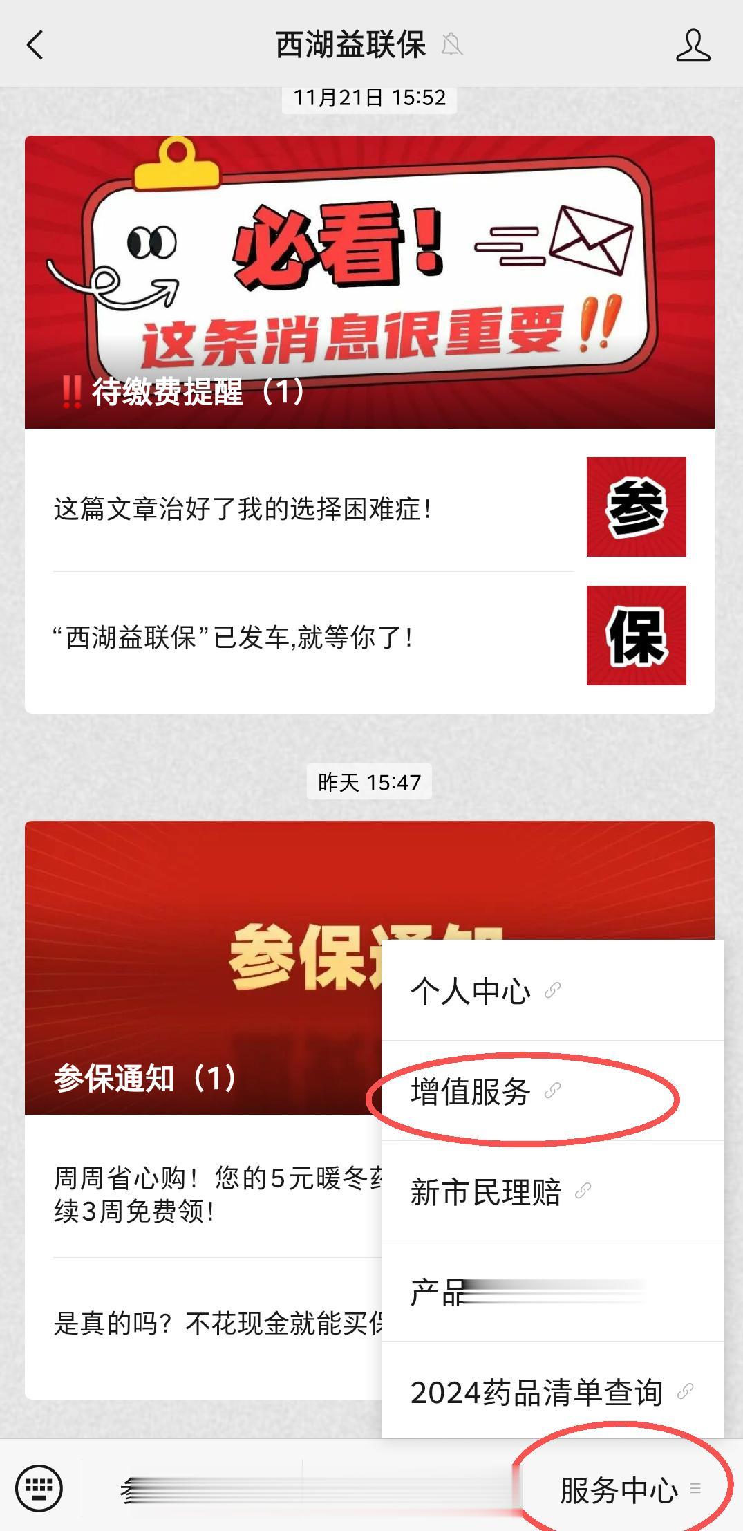 第一步:进入“西湖益联保”微信公众号,点击“服务中心”-“增值服务”