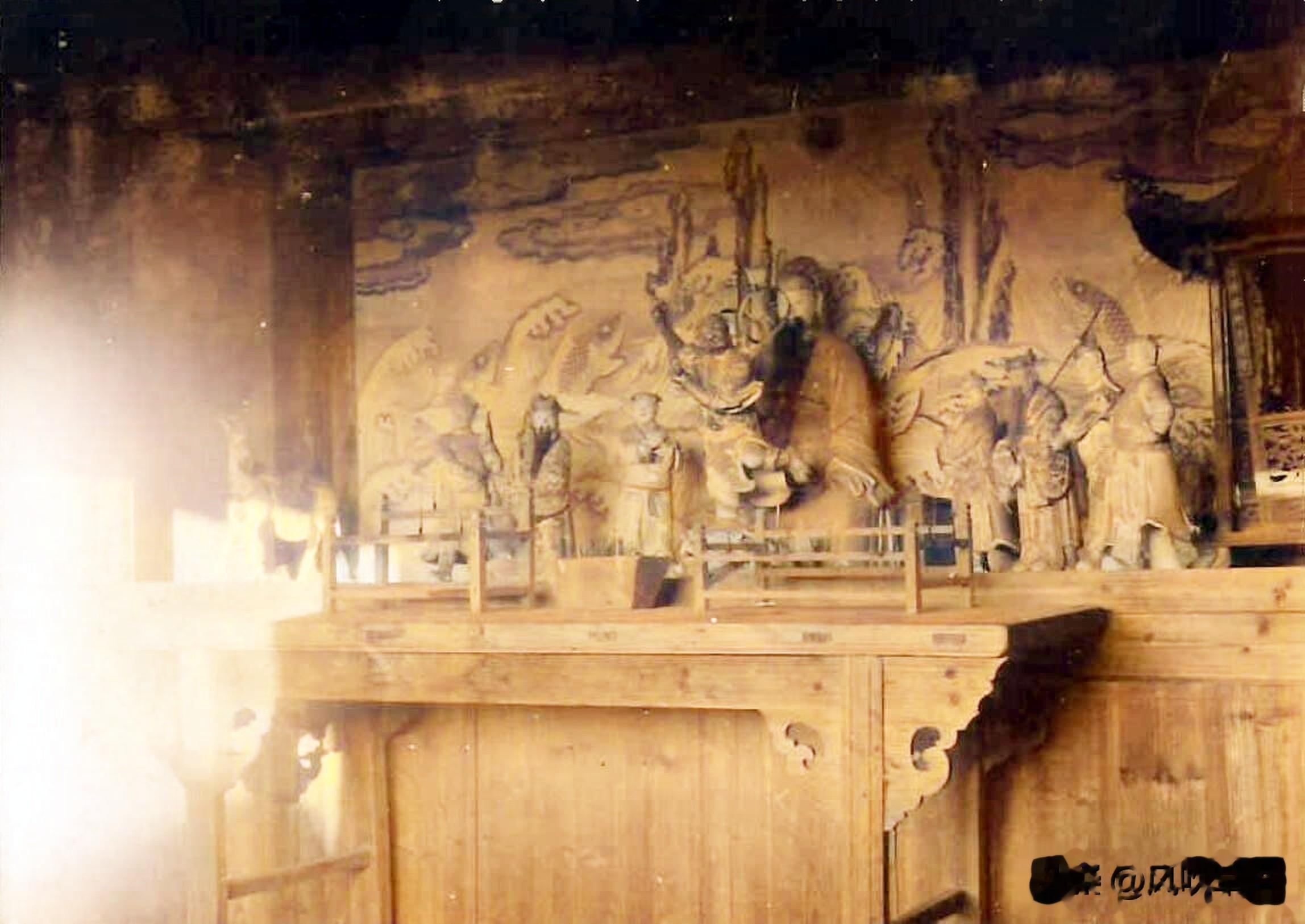 福州城的一座古戏台,雕梁画栋十分精美,台前的栏杆上装饰有人物和木雕。两边的柱子上写有对联,可惜看不清具体的内容。