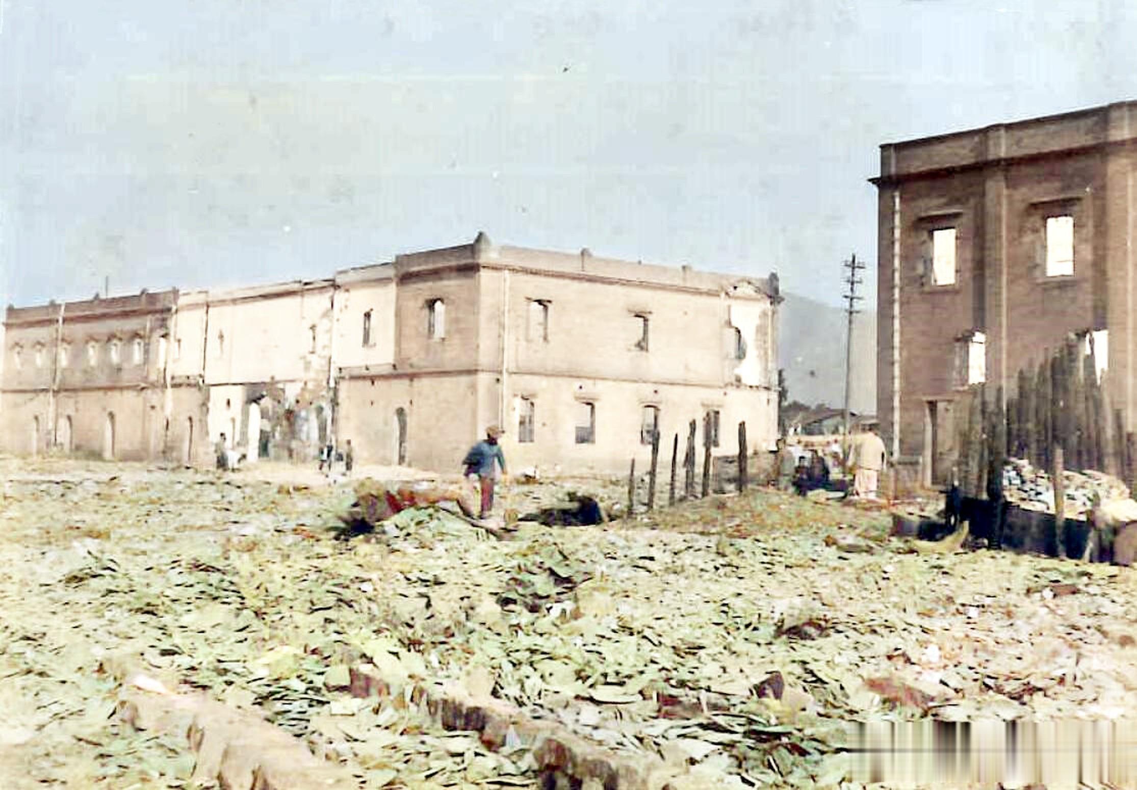 这是一座被焚毁之后的米店仓库,画面中小山一样的东西是火灾后米店中遗留的一堆稻米。 几名西方人正在围观。此时暴露在外的粮食已全部损毁,成了一堆废物。