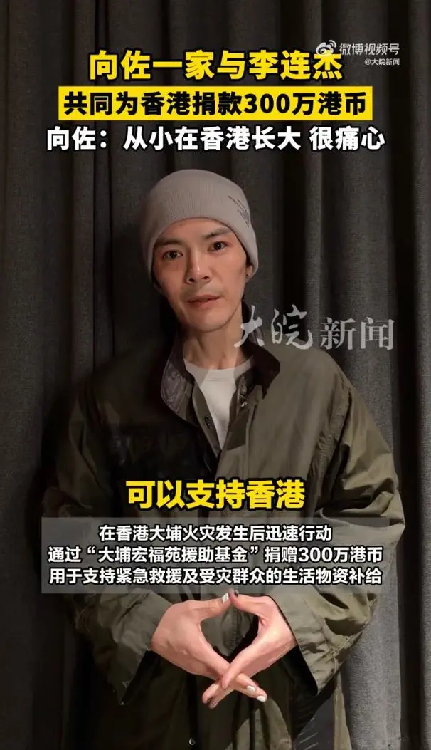 向佐的哽咽从不是空喊口号,而是真金白银的行动支撑——他与父母向华强、向太陈岚,联合师父李连杰共同发起的“有缘慈善基金”,第一时间向香港政府设立的“大埔宏福苑援助基金”捐赠300万港币,专项用于受灾居民的紧急救援、生活物资补给和短期生存保障。