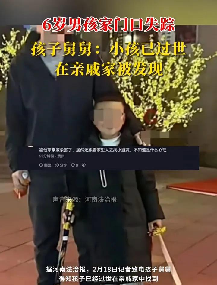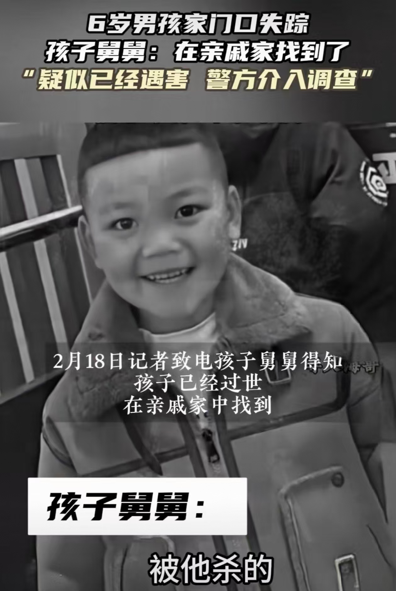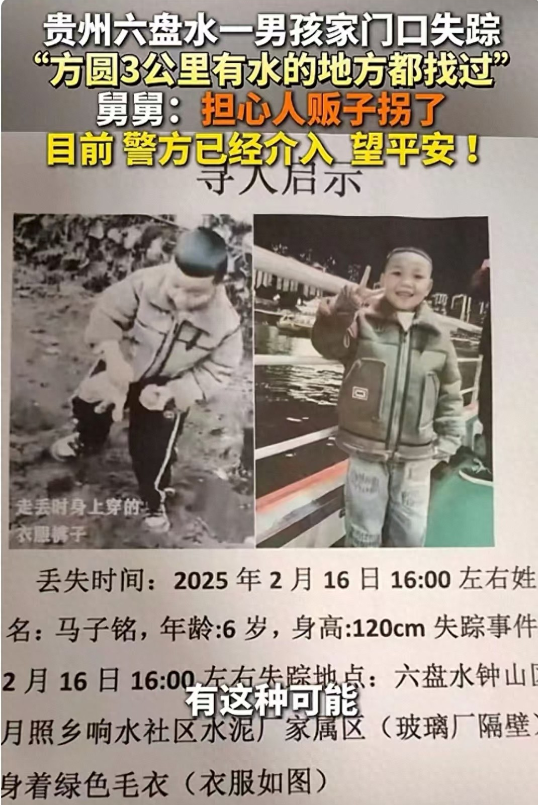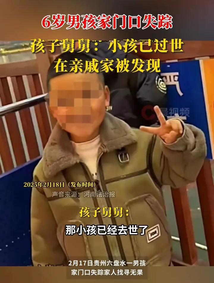 贵州六盘水失踪的6岁男孩在家门口失踪,舅舅称已在亲戚家找到,疑似已遇害。