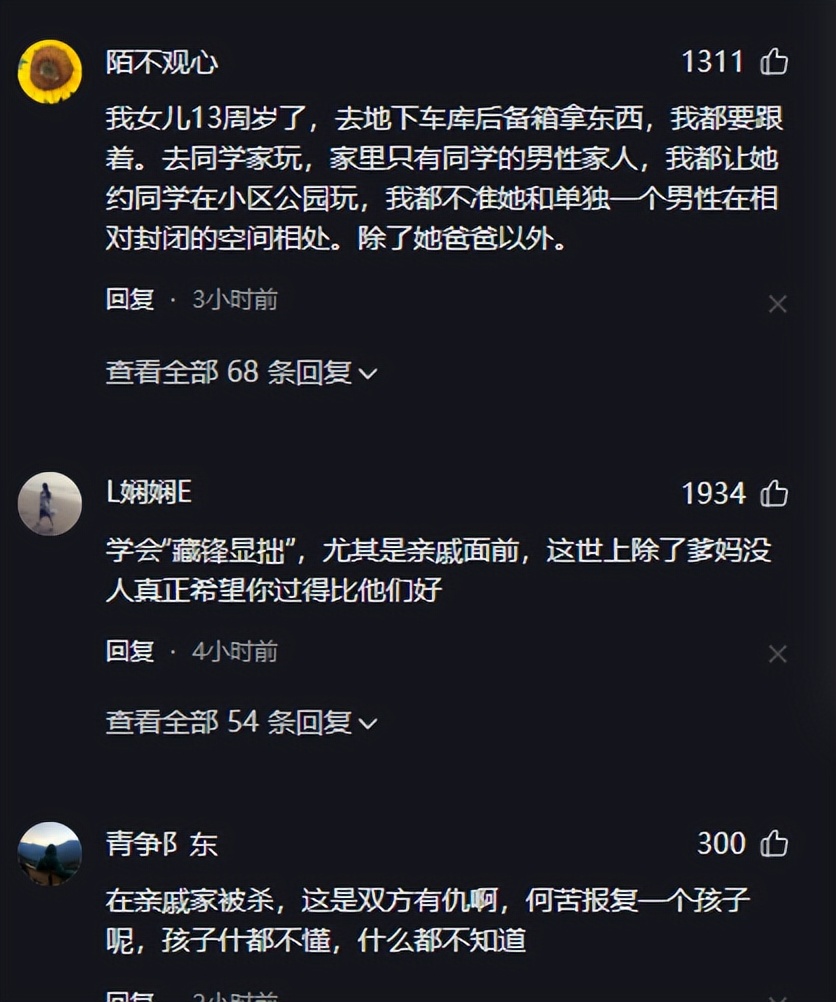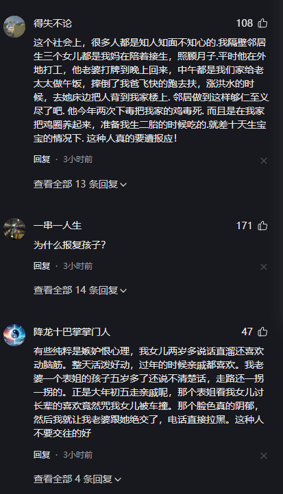 有网友则分享自己曾经看到过河南新乡的一个案子,也是邻居熟人害了一个小男孩,凶手也是带孙子的奶奶,原因好像是嫉妒别人的孙子比他的孙子身体好,比她的孙子聪明伶俐,再加上两个孩子年龄差不多大,最终痛下狠手。