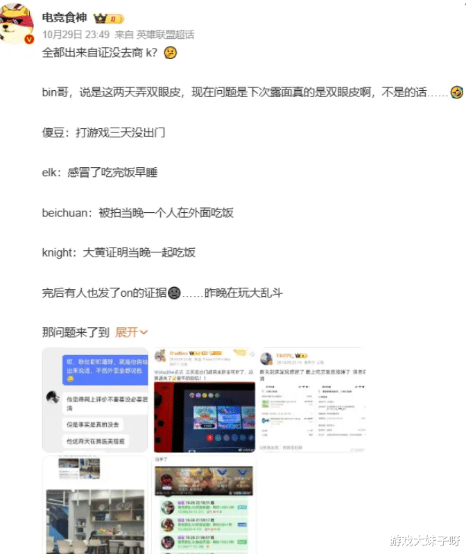 其他队员的身影模糊不清,于是“集体商K”的说法开始受到质疑,此时,BLG的选手们也纷纷站出来自证清白,一场堪比“刑侦剧”的“不在场证明大会”正式上演,北川表示自己那天晚上就在基地吃宵夜,并晒出了外卖记录;Elk称自己当时感冒发烧,正在买药休息,甚至拿出了购药凭证;Knight则说那晚和朋友大黄一起吃饭,大黄本人也亲自出面作证;Bin的理由则让网友哭笑不得——朋友爆料他正在做美容修复,因为刚“割了双眼皮”,而Shadow的解释更离谱,称自己那几天沉迷《宝可梦》,连门都没出。
