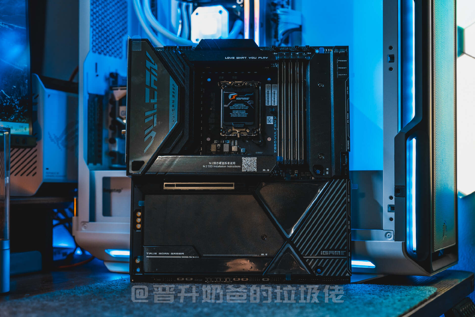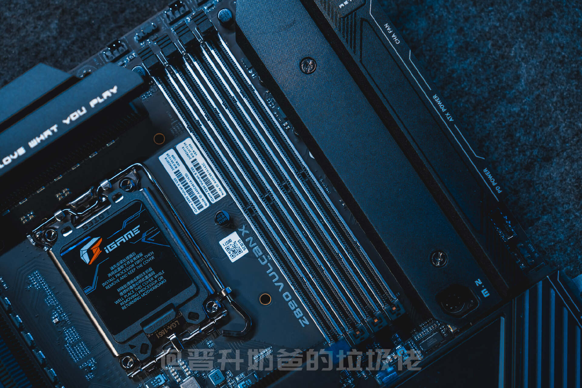 ▼主板搭配的是七彩虹iGame Z890 火神,平民旗舰 E-ATX板型,尺寸为305mm×277mm,正面大部分区域被纯黑色的散热装甲覆盖,仅露出CPU底座、内存插槽和PCIe插槽,颇具一体化设计美感。主板配备20+1+1+1相强化供电,并搭载众多高端日系铝聚合物电容,CPU核心最大电流支持可达105A,在当前市场上的Z890主板中处于T0级别。