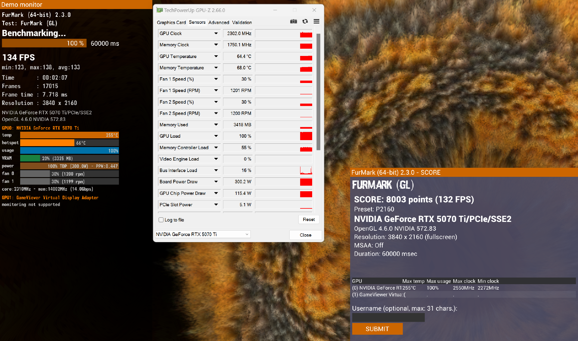 ▼FurMark烤机测试,烤机2Mins后,显卡温度为65°左右,显存温度68℃足有,显卡功耗为300W左右。